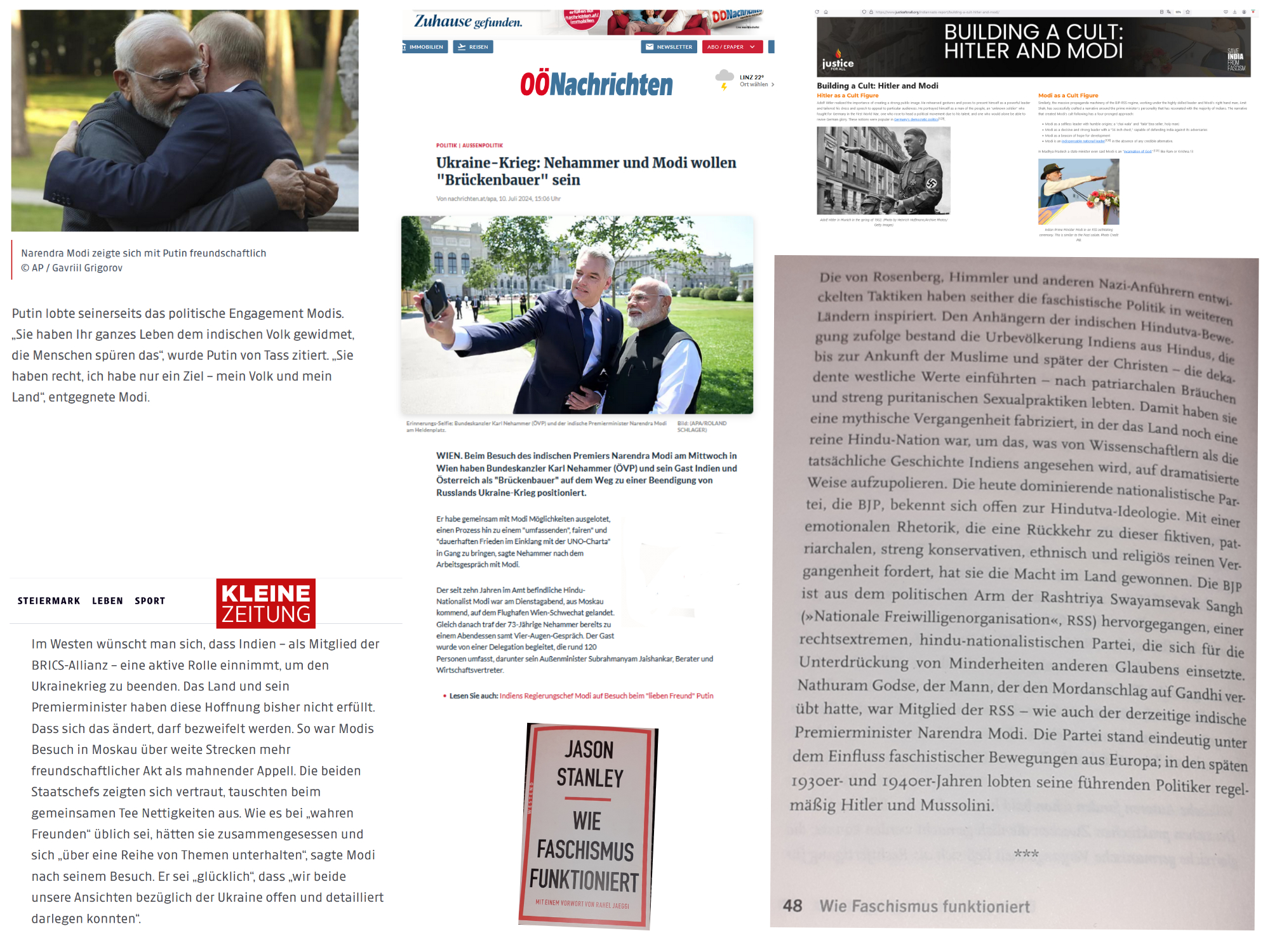 „Wie Faschismus funktioniert“, ein in diesen Tagen erst erschienenes Buch von Jason Stanley, das wie zum Geschenk auf die Brücke gelegt, die der Zurzeitige eben dem „lieben Freund“ in Wien baut, über die die „wahren Freunde“, der eine aus Moskau unsichtbar mit dabei, schreiten, und in diesem Buch ist zu lesen, über den „Brückenbauer Indien“, nein, nicht über „Indien“, „Indien“ als „Brückenbauer“ nennt nur der Zurzeitige, in „Wie Faschismus funktioniert“ ist über den „Brückenbauer“, der dem Zurzeitigen „Indien“ ist, „Narendra Modi“ zu erfahren, in „Wie Faschismus funktioniert“ ist also etwas über den „Brückenbauer“ Narendra Modi zu erfahren: