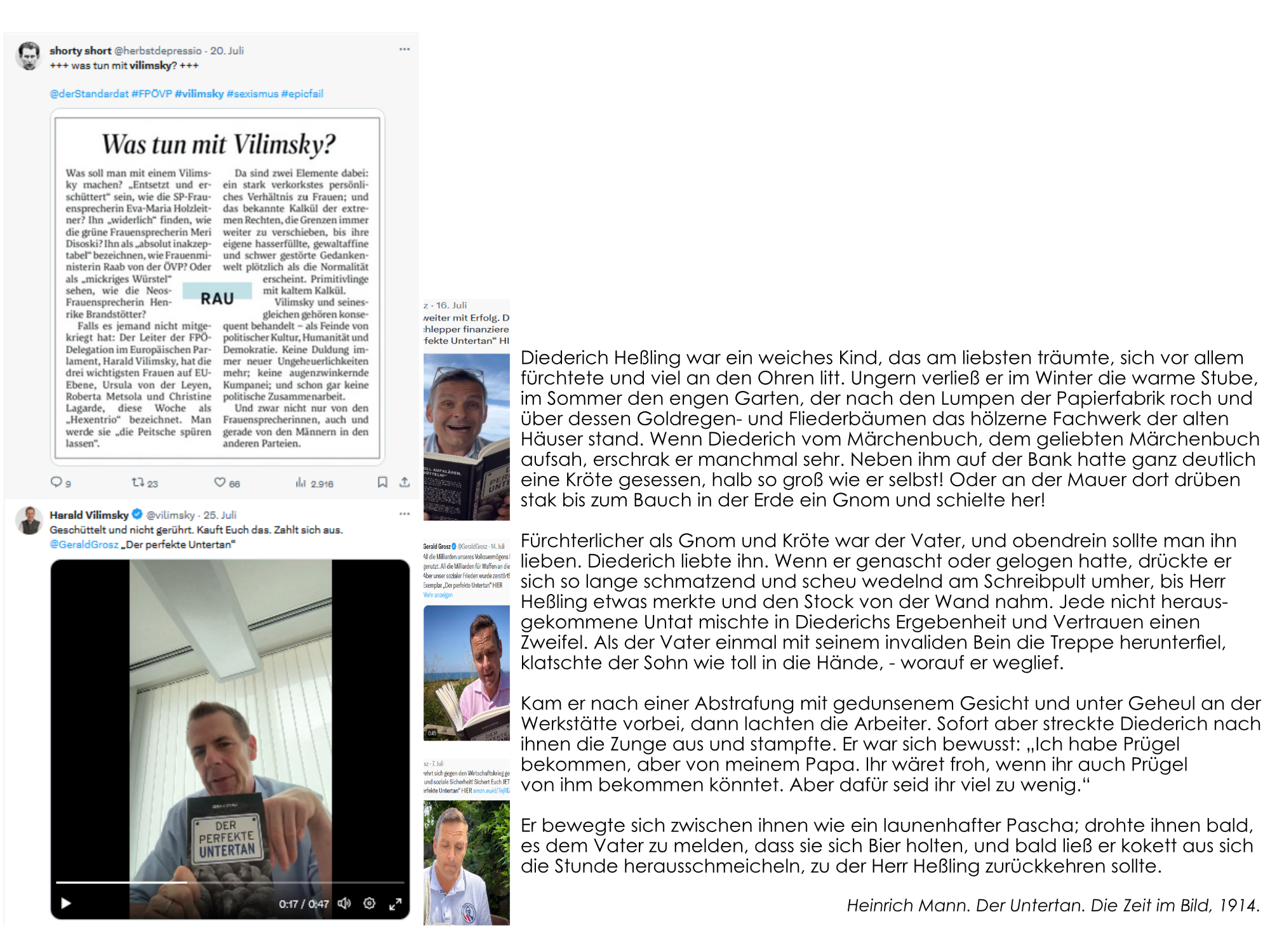 Es ist, und auch das ist Harald Vilimsky zuzugestehen, eine wahre Horizonterweiterung, den Untertanen zu lesen, eine wahre Quelle der Erkenntnis, Absatz für Absatz, Kapitel für Kapitel … Petra Steger würde wohl Gerald Grosz nach seiner Lesung einer Passage aus dem Untertanen mit seiner Hauptfigur als Vorgestalt und Nachgestalt mit Danke, lieber Gerald! zuwinken …