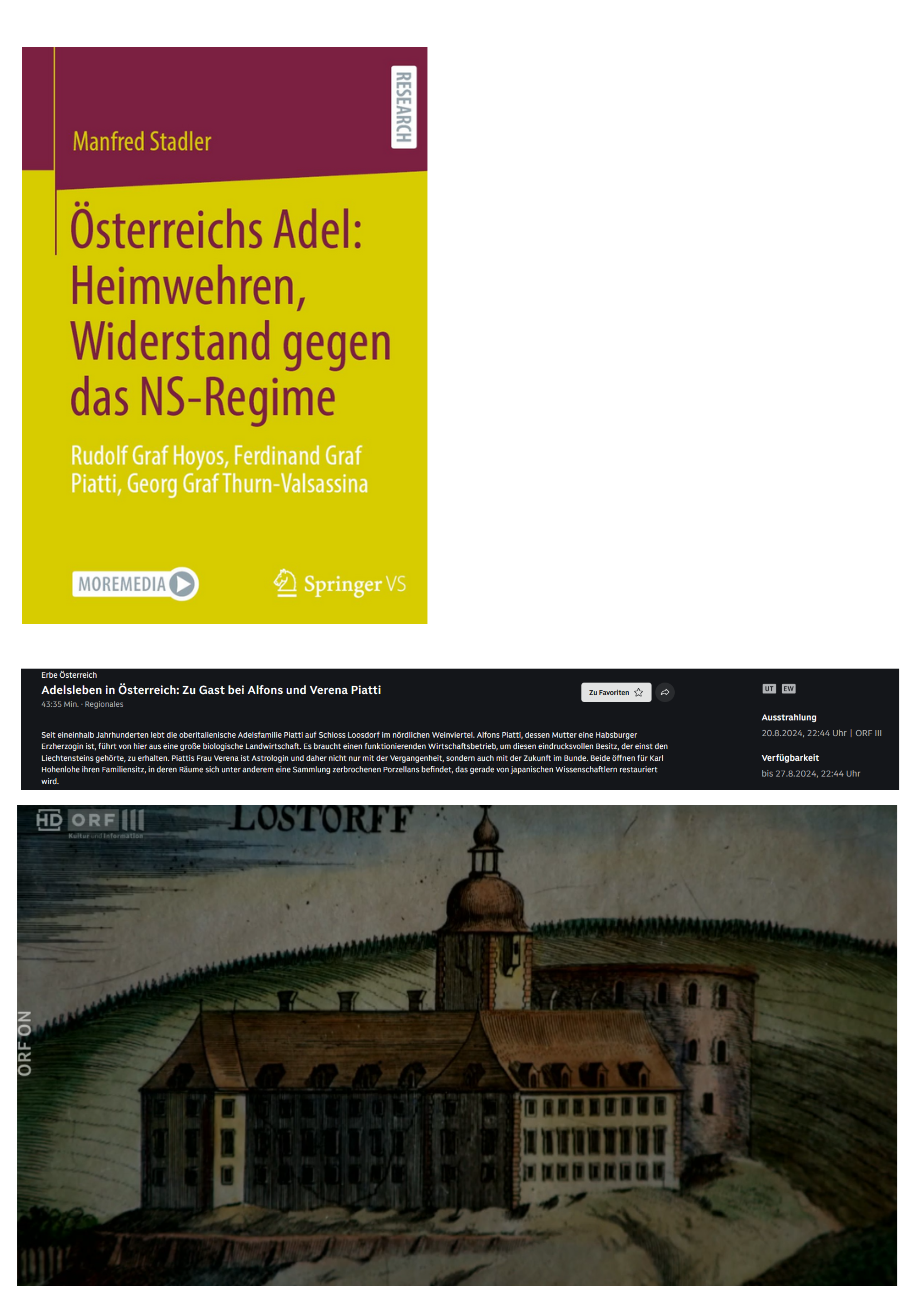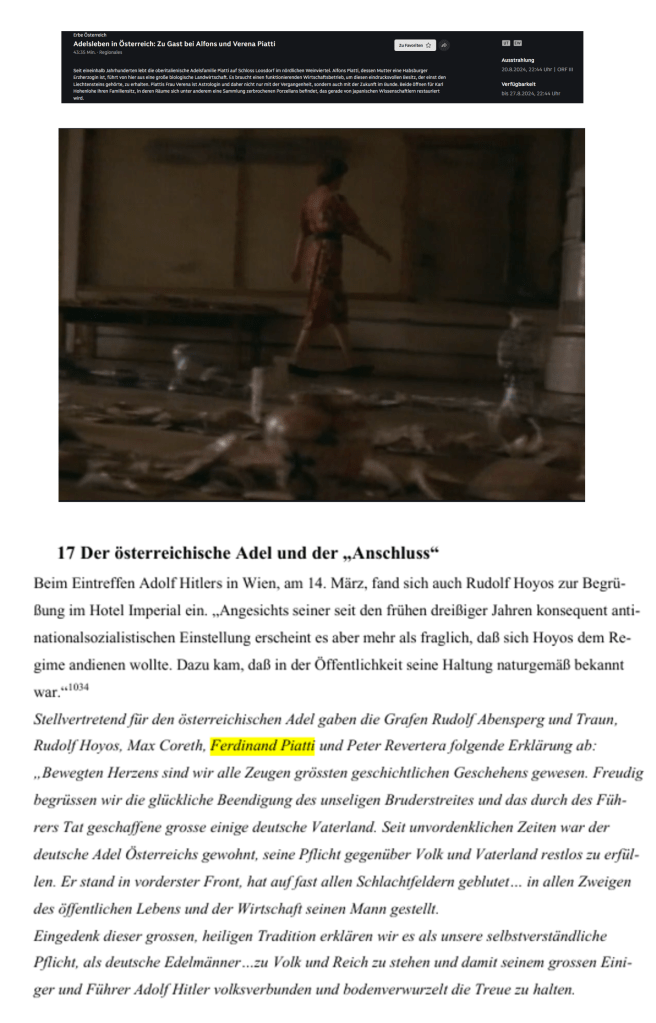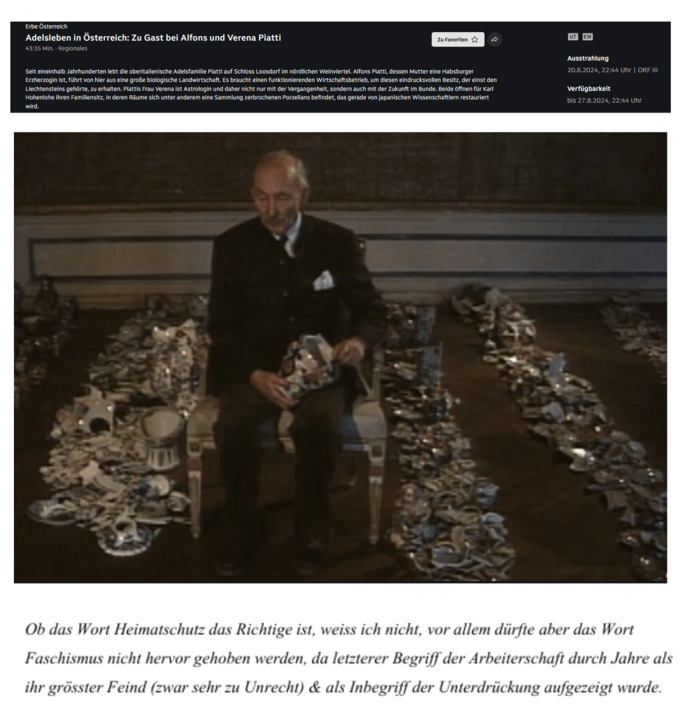 Am 20. August 2024 wieder einmal im falschesten Moment oder zum rechtesten Zeitpunkt den Fernsehapparat eingeschaltet, um folgende Geschichtsvorstellung im öffentlich-rechtlichen Rundfunk Österreichs zu hören, in der Sendung „Erbe Österreich“ mit Karl Hohenlohe, der diesmal zum idyllischen Besuch bei der Familie Piatti, in ihrem Schloß, in dem die Mutter der Astrologie zugetan, die Tochter Menschen mit ihrem „Heilssingen“ beglückt: