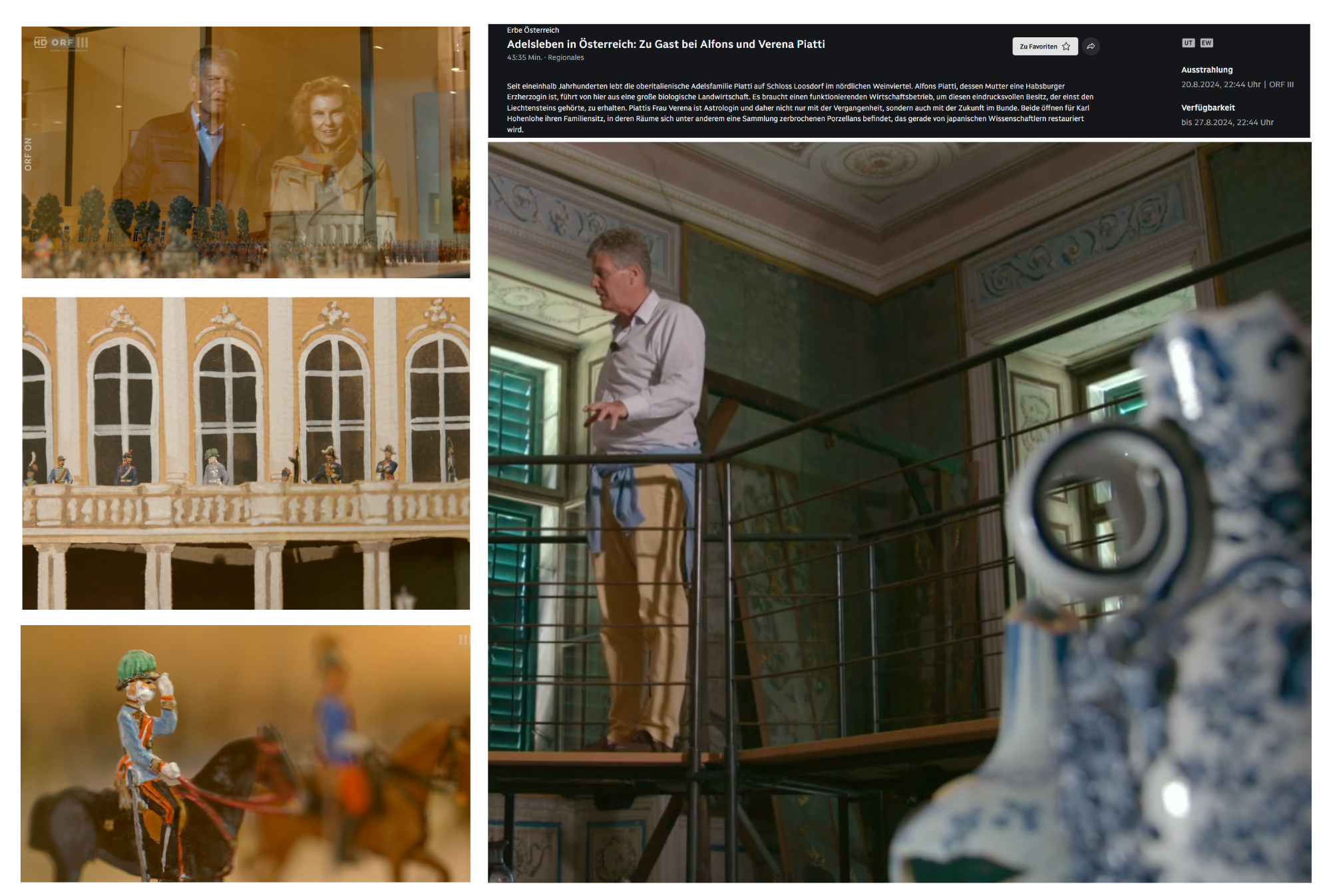 Berichtsstimme aus dem Off: Als sich gegen Ende des Zweiten Weltkriegs die russischen Soldaten durch das von der deutschen Armee verwüstete Osteuropa Loosdorf näherten, um auch Österreich vom Nationalsozialismus zu befreien, versuchte der Großvater des heutigen Besitzers, Ferdinand Piatti, die Sammlung zu verstecken, wie sich sein Sohn in einer Willkommen-Österreich-Sendung 1996 erinnert: