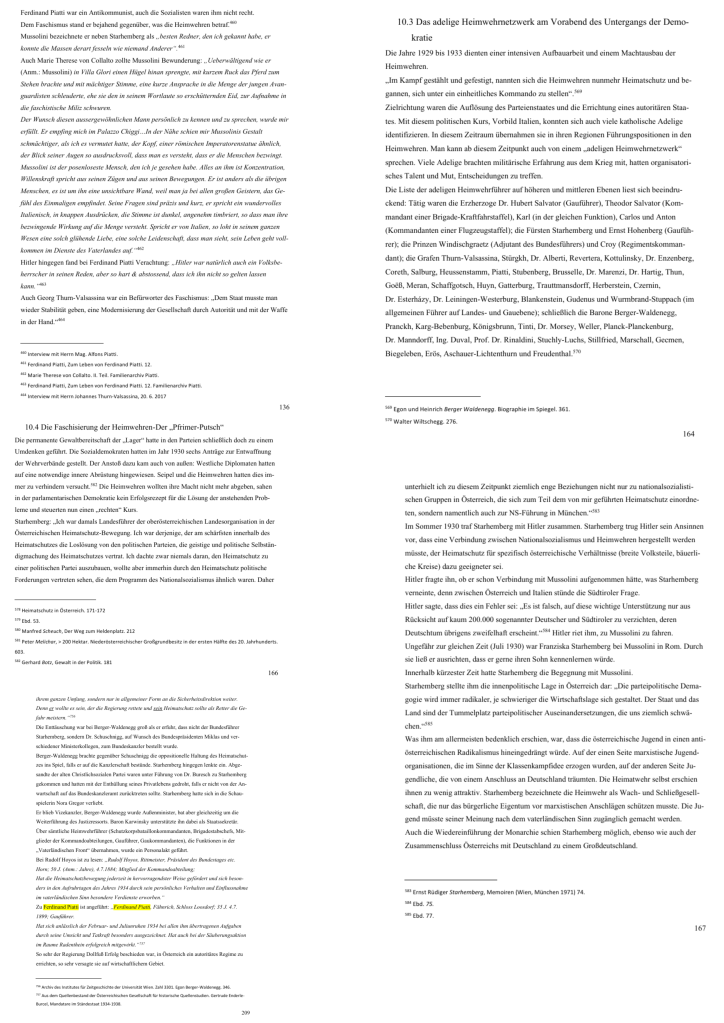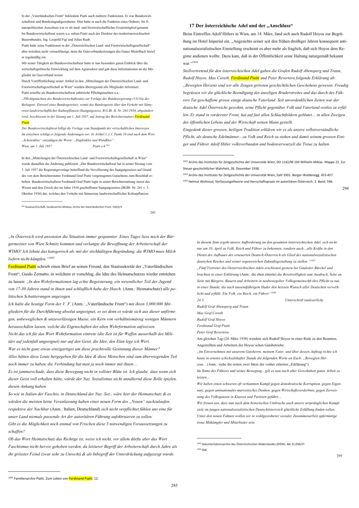 Rudolf Hoyos, Ferdinand Piatti und Georg Thurn-Valsassina waren miteinander durch viele Netzwerke, die eng geknüpft waren, verbunden: Verwandtschaft, Freunde, Heimwehren, „Vereinigung katholischer Edelleute in Österreich“, „Vaterländische Front“ und „Österreichische Land- und Forstwirtschaftsgesellschaft in Wien“. Hoyos und Piatti waren Mitglieder im Malteser-Ritter-Orden. Rudolf Hoyos hatte noch Mitgliedschaften im „Jockey-Club für Österreich“, in der „Viribus unitis“, im „Reit- und Polo-Klub“ und in der „Leo-Gesellschaft“. Ende der 1920er Jahre waren die drei Grafen als Kommandanten in den Heimwehren, Hoyos und Piatti in Niederösterreich, Thurn-Valsassinain Kärnten, zu finden und schließlich an den Februarkämpfen und an der Niederschlagung des NS-Putsches 1934 beteiligt. Nach dem Ersten Weltkrieg waren sie christlichsozial, ab ihrem Eintritt in die Heimwehren faschistisch orientiert. In der „Österreichischen Land- und Forstwirtschaftsgesellschaft in Wien“ fanden Rudolf Hoyos und Ferdinand Piatti ein reiches Betätigungsfeld. In dieser Gesellschaft bekleideten sie mehrere Funktionen und veröffentlichten in den„Mitteilungen der Land- und Forstwirtschaftsgesellschaft in Wien“zahlreiche Artikel. Politische Aufgabengebiete bekamen Hoyos, Piatti und Thurn-Valsassinac innerhalb der „Vaterländischen Front“: Rudolf Hoyos hatte hier die höchsten Funktionen als Vorsitzender des Staatsrates und Präsident des Bundestages inne. Ferdinand Piatti war Bundeswirtschaftsrat in der Sektion Land-und Forstwirtschaft, Mitglied des Bundestages, des Budget-und Finanzausschusses und des Sozialpolitischen Ausschusses. Georg Thurn-Valsassina war Staatsrat, im Außenpolitischen Ausschuss und Bundesjugendführer von „Jung-Vaterland“. In dieser Funktion veröffentlichte er auch zahlreiche Artikel in den Organen der Arbeitsgemeinschaften der österreichischen Jugendverbände. Rudolf Hoyos war Legitimist. Piatti und Thurn-Valsassina standen den legitimistischen Organisationen nahe. Beim „Anschluss“ sprachen sich Hoyos und Piatti für die Vereinigung mit dem Deutschen Reich aus. Rudolf Hoyos und Georg Thurn-Valsassina wurden mehrmals von der Gestapo verhaftet. Ferdinand Piatti wurde nicht verhaftet, da er politisch im „Ständestaat“ nicht so exponiert gewesen war. Piatti nahm als Offizier der Deutschen Wehrmacht am Zweiten Weltkrieg teil (bis Sommer 1943). Auch Rudolf Hoyos wurde zur Deutschen Wehrmacht eingezogen und war für die Assentierung von Pferden zuständig (bis Juli 1944). Hoyos und Piatti hatten im Krieg den Tod ihrer Söhne zu beklagen (Hoyoseinen, Piatti zwei Söhne). Im adeligen Widerstandsnetzwerk fanden sich Ferdinand Piatti und seine Frau Anna („Widerstandsgruppe Helfenberg“ von Peter Revertera).