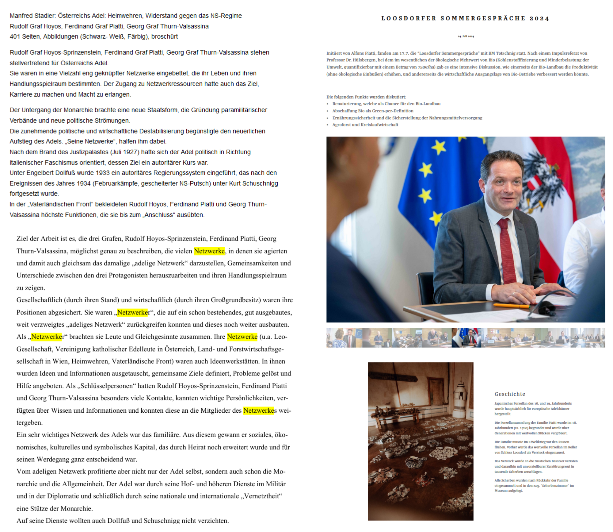 An den adeligen Netzen wird, kann einfach wie kurz gesagt werden, weiter gesponnen, wie es auch die Lostorffer Sommergespräche 2024 nahelegen. Wenn auch die Zitate zu Ferdinand Piatti den Eindruck erwecken, es ginge um ihn und seine Familie,