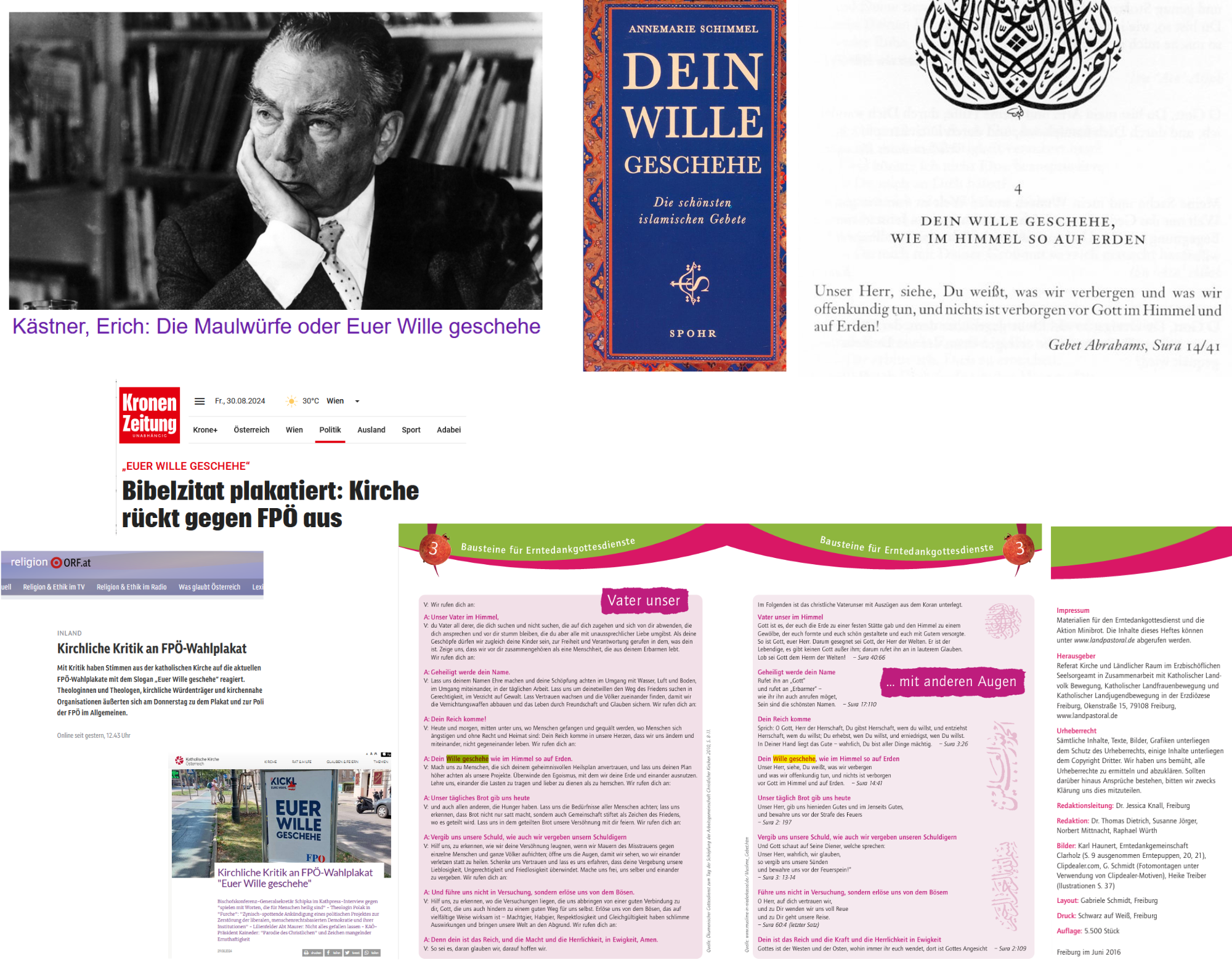 Erich Kästner zu plakatieren, meinen Sie, könne doch nicht eine eine derartige Aufregung verursachen. Doch. Es muß bloß der Wille zu einer Aufregung stark genug sein. Dann geschieht die Aufregung wie von selbst. Es muß nur verbreitet werden, diese Partei habe etwas aus der Bibel zitiert. Verdrängt, verschwiegen muß dabei bloß werden, daß es genauso Erich Kästner schrieb: „Euer Wille geschehe“. Dafür muß nur laut in die Aufregung gedrängt werden, diese Partei habe sich am Glauben vergangen, einen Spruch plakatiert, der wörtlich lautet: „Dein Wille geschehe“ — „Dein Wille geschehe – Die schönsten islamischen Gebete“ von Schimmel Annemarie, 5. Auflage 2004, Spohr, Kandern im Schwarzwald.