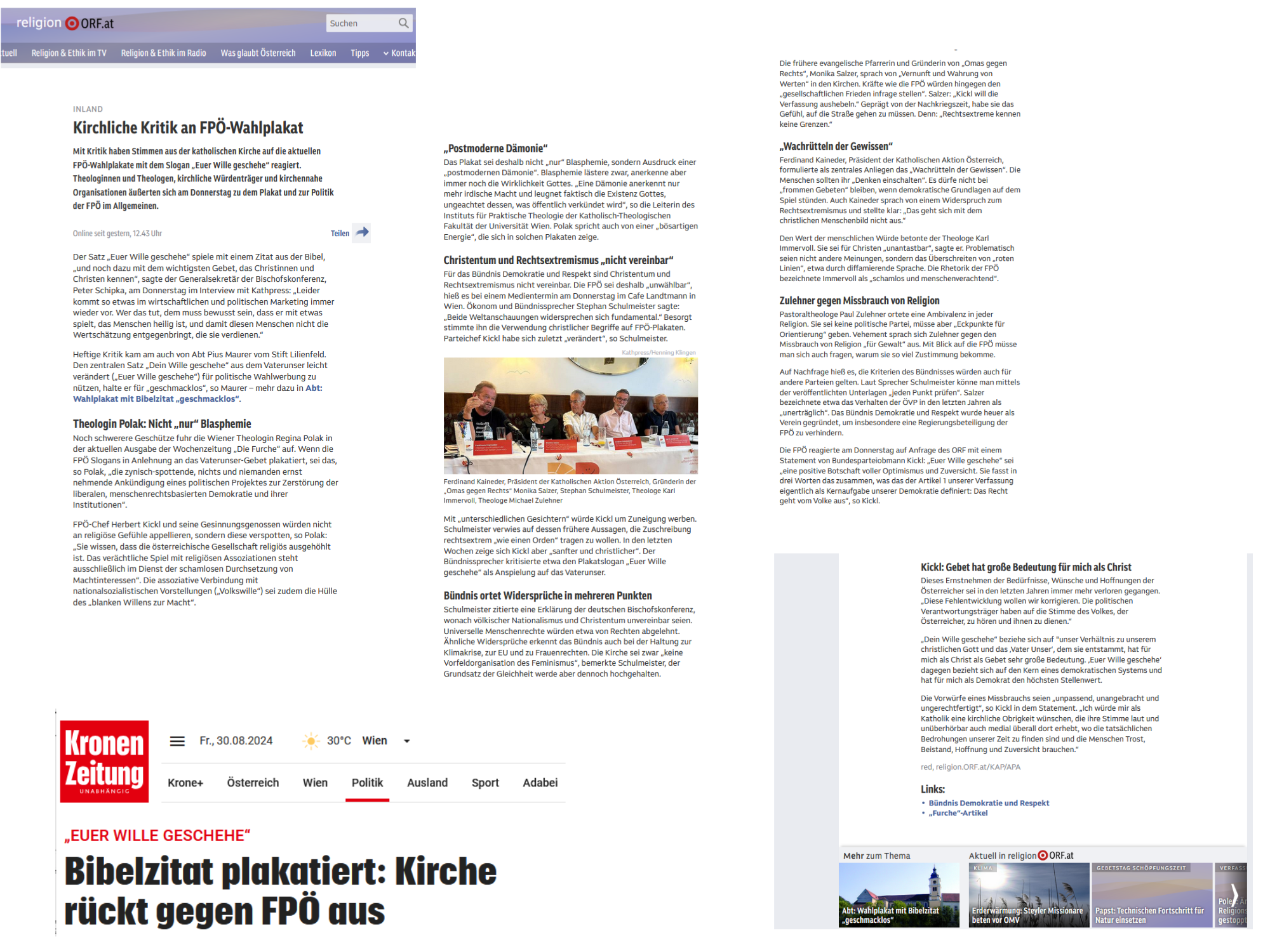 Zulehner indes nahm den weiteren Plakat-Slogan „Dein Herz sagt Ja“ zum Anlass, nach dem Verstand zu fragen: „Es geht immer nur um Emotionen“ – dabei brauche Demokratie und eine reife Wahlentscheidung „politische Nachdenklichkeit“. Dass der FP-Obmann offenbar an einem „eigenen Kickl-Vaterunser“ arbeite, zeuge indes von einem „Missbrauch der Religion eigener Art“.