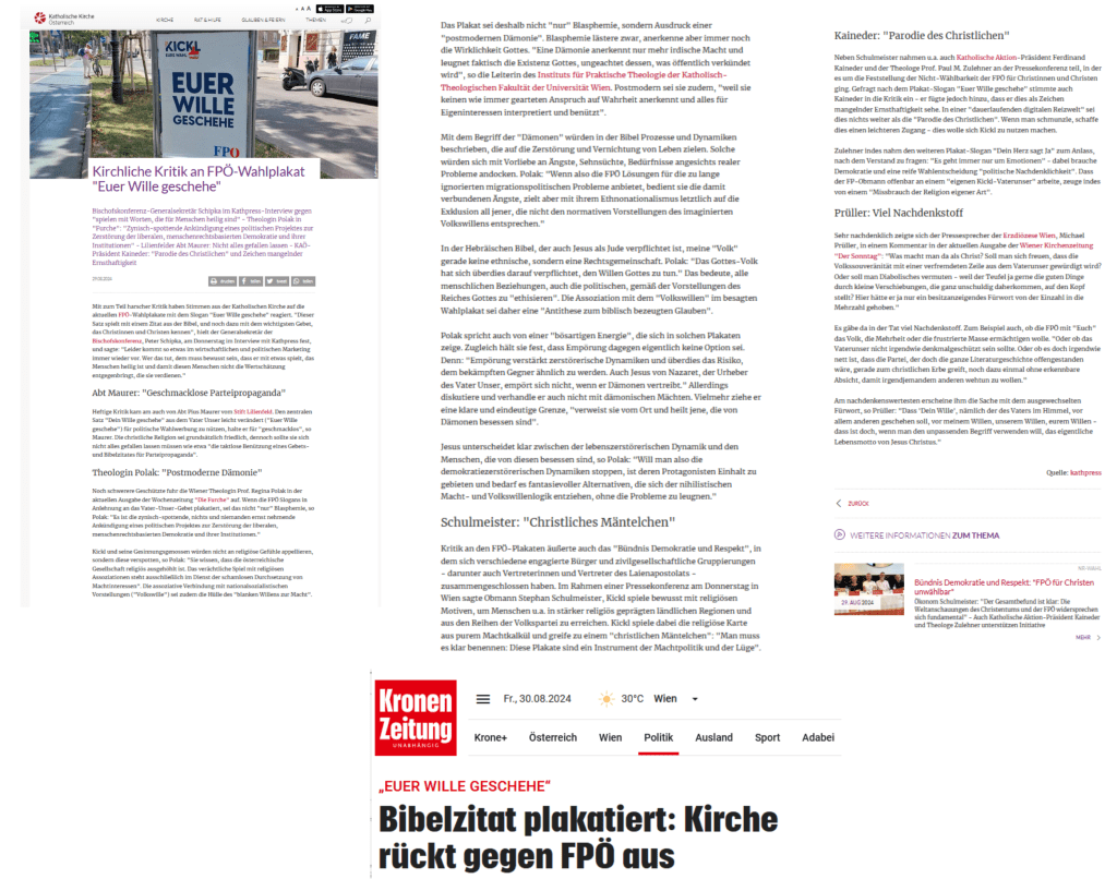 Noch schwerere Geschütze fuhr die Wiener Theologin Regina Polak in der aktuellen Ausgabe der Wochenzeitung „Die Furche“ auf. Wenn die FPÖ Slogans in Anlehnung an das Vaterunser-Gebet plakatiert, sei das, so Polak, „die zynisch-spottende, nichts und niemanden ernst nehmende Ankündigung eines politischen Projektes zur Zerstörung der liberalen, menschenrechtsbasierten Demokratie und ihrer Institutionen“. Das Plakat sei deshalb nicht „nur“ Blasphemie, sondern Ausdruck einer „postmodernen Dämonie“. Blasphemie lästere zwar, anerkenne aber immer noch die Wirklichkeit Gottes. „Eine Dämonie anerkennt nur mehr irdische Macht und leugnet faktisch die Existenz Gottes, ungeachtet dessen, was öffentlich verkündet wird“, so die Leiterin des Instituts für Praktische Theologie der Katholisch-Theologischen Fakultät der Universität Wien. Postmodern sei sie zudem, „weil sie keinen wie immer gearteten Anspruch auf Wahrheit anerkennt und alles für Eigeninteressen interpretiert und benützt“.