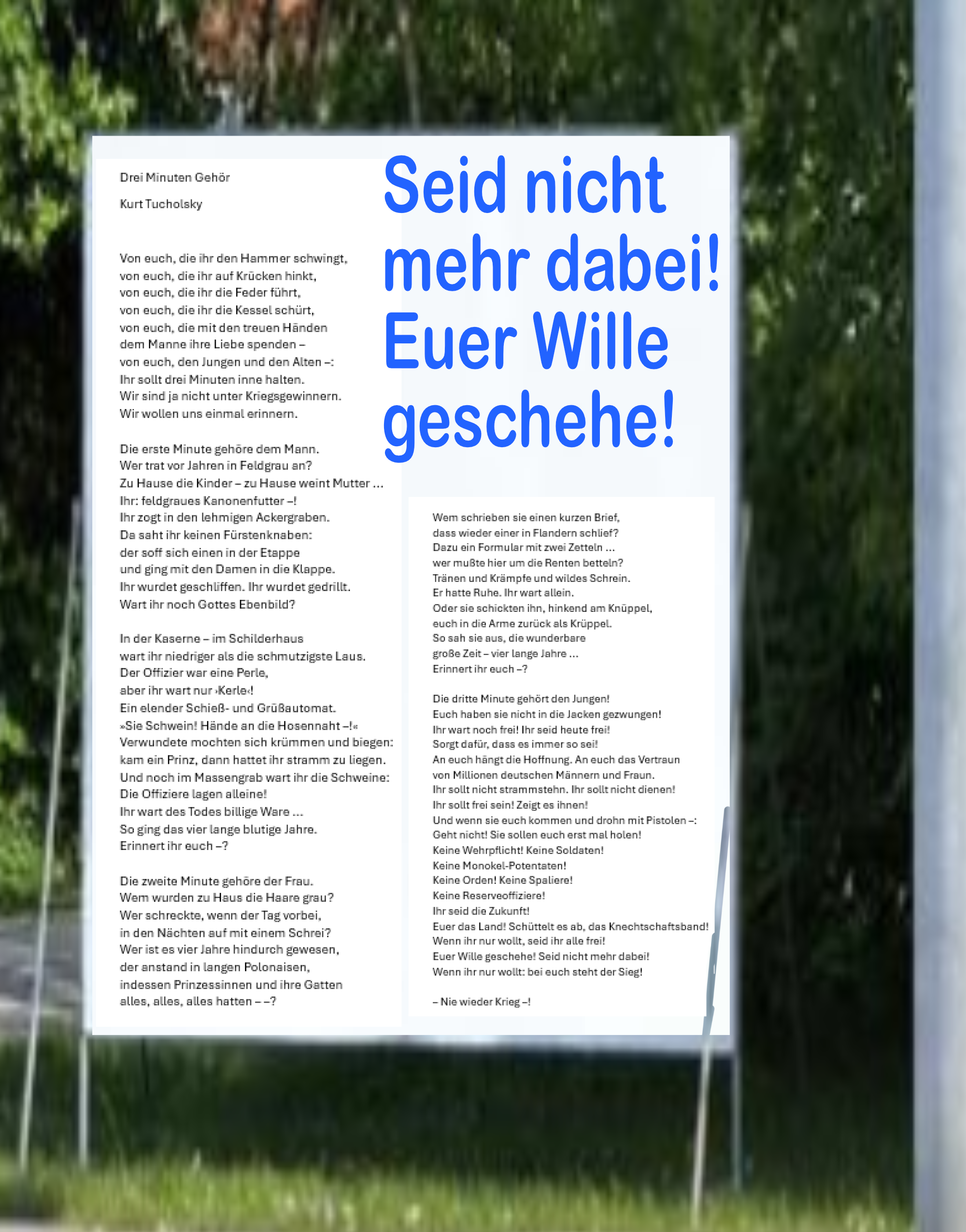„Euer Wille geschehe“, ein Vers von Kurt Tucholsky, in seinem Gedicht „Drei Minuten Gehör“. Kurt Tucholsky geht in seinem Gedicht weiter, er schreibt nicht nur „Euer Wille geschehe“, er schreibt auch: „Seid nicht mehr dabei!“