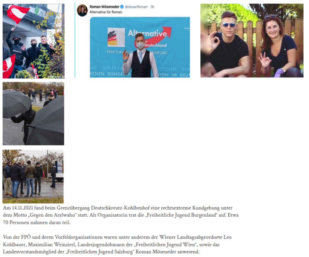 Am 14.11.2021 fand beim Grenzübergang Deutschkreutz-Kohlbenhof eine rechtsextreme Kundgebung unter dem Motto „Gegen den Asylwahn“ statt. Als Organisatorin trat die „Freiheitliche Jugend Burgenland“ auf. Etwa 70 Personen nahmen daran teil. Von der FPÖ und deren Vorfeldorganisationen waren unter anderem der Wiener Landtagsabgeordnete Leo Kohlbauer, Maximilian Weinzierl, Landesjugendobmann der „Freiheitlichen Jugend Wien“, sowie das Landesvorstandsmitglied der „Freiheitlichen Jugend Salzburg“ Roman Möseneder anwesend. Zur Kundgebung hatten auch rechtsextreme „Identitäre“ aufgerufen. Fast ein Drittel der Teilnehmer*innen der Kundgebung kann dieser Gruppe bzw. deren Umfeld zugerechnet werden. Die „Identitären“ waren nicht nur als Teilnehmer*innen vor Ort, sondern unterstützten die „Freiheitliche Jugend Burgenland“ bei der Organisation der Kundgebung. Ein rechtsextremer „Identitärer“ hielt als Funktionär der „Freiheitlichen Jugend Wien“ eine Rede und gab sich als Unterstützer und Teilnehmer der rassistischen „Grenzgänger“-Kampagne der „Identitären“ zu erkennen. Auch eine Handvoll Rechtsextremer aus dem direkten Umfeld des Neonazis Gottfried Küssel nahm an der Kundgebung teil. Diese Rechtsextremen wurden bei deren Ankunft