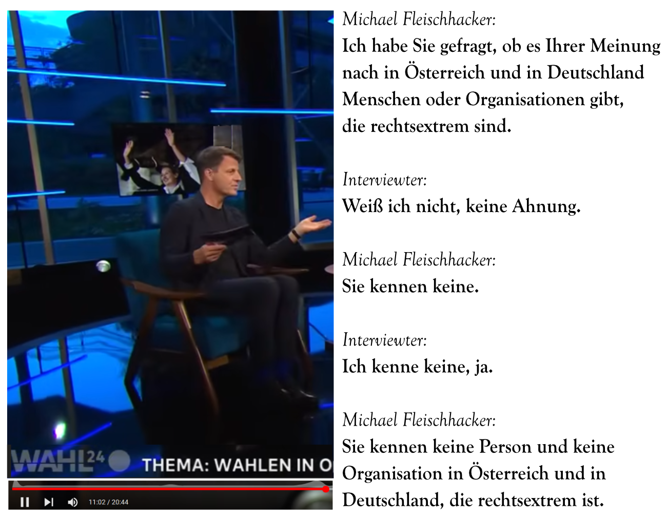 Und der Moderator dieser Interviewnacht vor nicht einmal vierzehn Tagen im September ’24 selbst ein in diesem Traditionsgeleitetem aufgeganger Mann hätte wie Herr Lugner, hätte wie des Herrn Lugner Wiedergänger, wäre er gefragt worden, geantwortet, er sehe keine Rechtsextremen, er kenne keine Rechtsextremen,