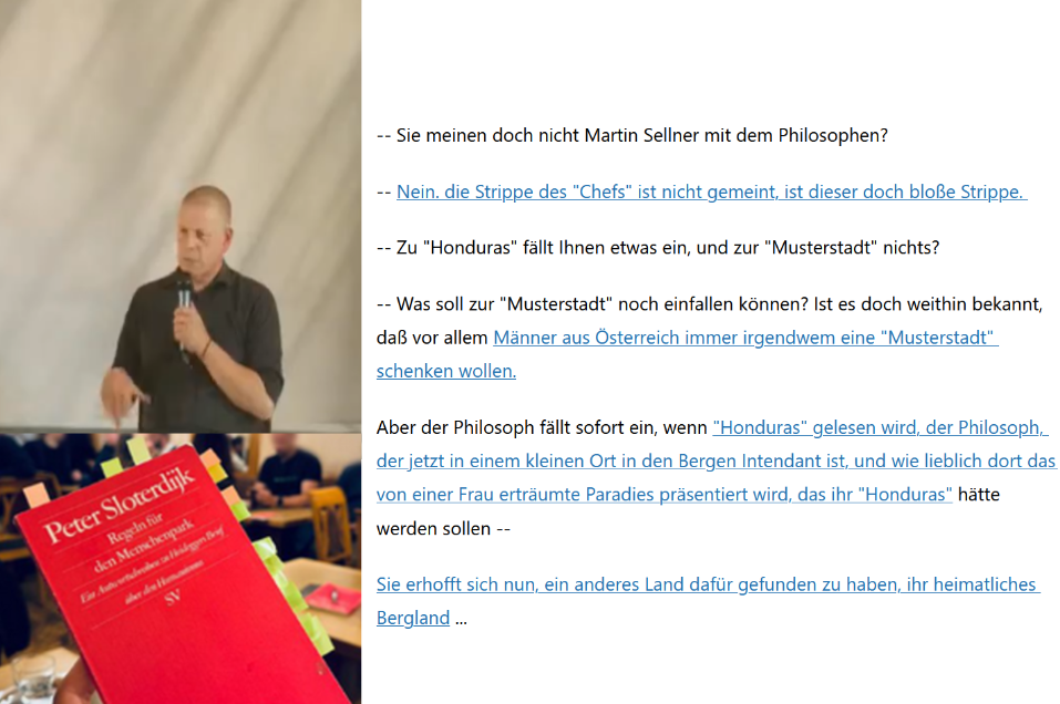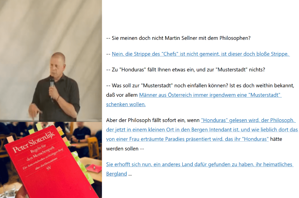 Aber der Philosoph fällt sofort ein, wenn „Honduras“ gelesen wird, der Philosoph, der jetzt in einem kleinen Ort in den Bergen Intendant ist, und wie lieblich dort das von einer Frau erträumte Paradies präsentiert wird, das ihr „Honduras“ hätte werden sollen —