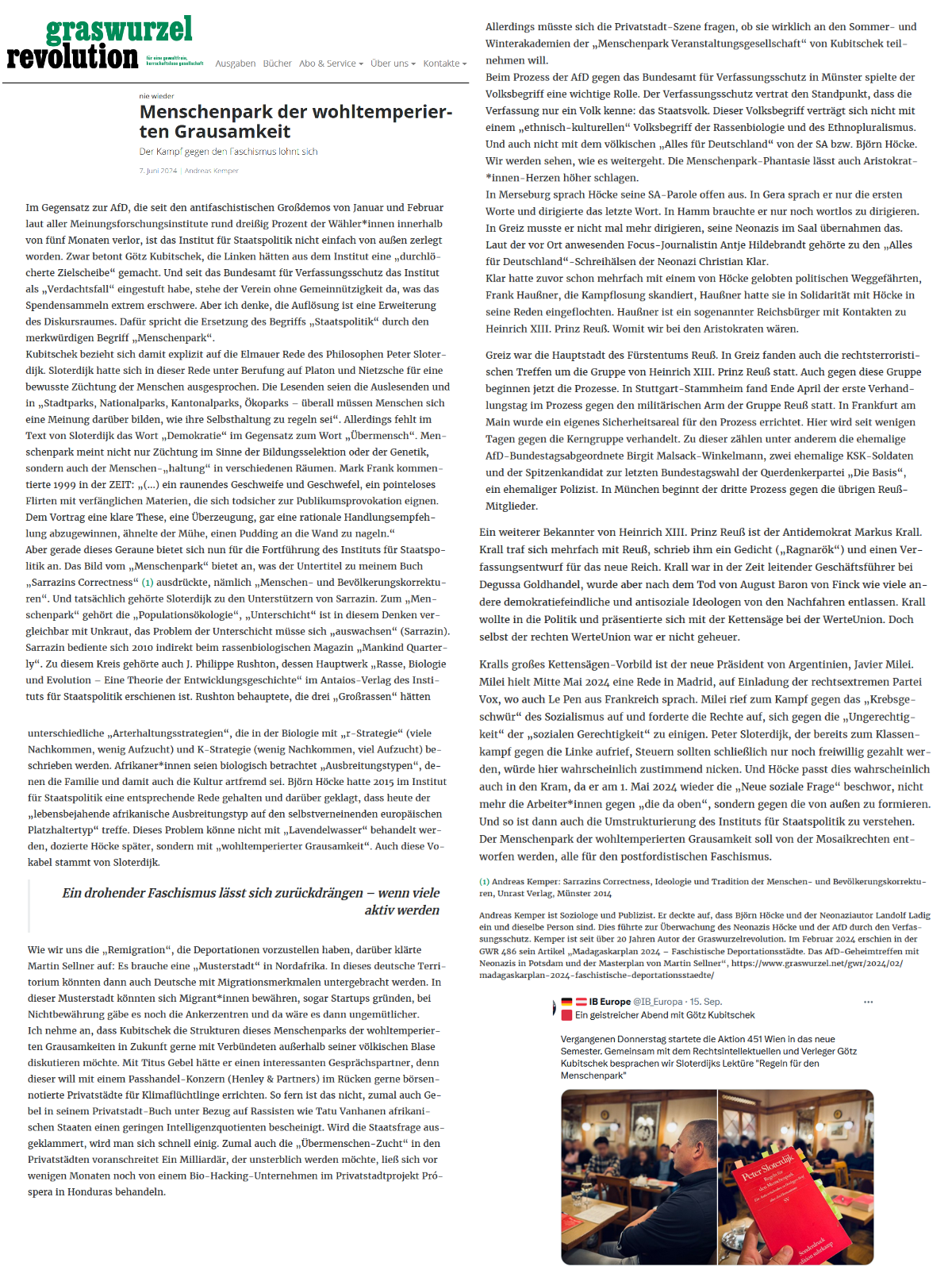 Wie wir uns die „Remigration“, die Deportationen vorzustellen haben, darüber klärte Martin Sellner auf: Es brauche eine „Musterstadt“ in Nordafrika. In dieses deutsche Territorium könnten dann auch Deutsche mit Migrationsmerkmalen untergebracht werden. In dieser Musterstadt könnten sich Migrantinnen bewähren, sogar Startups gründen, bei Nichtbewährung gäbe es noch die Ankerzentren und da wäre es dann ungemütlicher. Ich nehme an, dass Kubitschek die Strukturen dieses Menschenparks der wohltemperierten Grausamkeiten in Zukunft gerne mit Verbündeten außerhalb seiner völkischen Blase diskutieren möchte. Mit Titus Gebel hätte er einen interessanten Gesprächspartner, denn dieser will mit einem Passhandel-Konzern (Henley & Partners) im Rücken gerne börsennotierte Privatstädte für Klimaflüchtlinge errichten. So fern ist das nicht, zumal auch Gebel in seinem Privatstadt-Buch unter Bezug auf Rassisten wie Tatu Vanhanen afrikanischen Staaten einen geringen Intelligenzquotienten bescheinigt. Wird die Staatsfrage ausgeklammert, wird man sich schnell einig. Zumal auch die „Übermenschen-Zucht“ in den Privatstädten voranschreitet Ein Milliardär, der unsterblich werden möchte, ließ sich vor wenigen Monaten noch von einem Bio-Hacking-Unternehmen im Privatstadtprojekt Próspera in Honduras behandeln. Allerdings müsste sich die Privatstadt-Szene fragen, ob sie wirklich an den Sommer- und Winterakademien der „Menschenpark Veranstaltungsgesellschaft“ von Kubitschek teilnehmen will. Beim Prozess der AfD gegen das Bundesamt für Verfassungsschutz in Münster spielte der Volksbegriff eine wichtige Rolle. Der Verfassungsschutz vertrat den Standpunkt, dass die Verfassung nur ein Volk kenne: das Staatsvolk. Dieser Volksbegriff verträgt sich nicht mit einem „ethnisch-kulturellen“ Volksbegriff der Rassenbiologie und des Ethnopluralismus. Und auch nicht mit dem völkischen „Alles für Deutschland“ von der SA bzw. Björn Höcke. Wir werden sehen, wie es weitergeht. Die Menschenpark-Phantasie lässt auch Aristokrat-innen-Herzen höher schlagen.