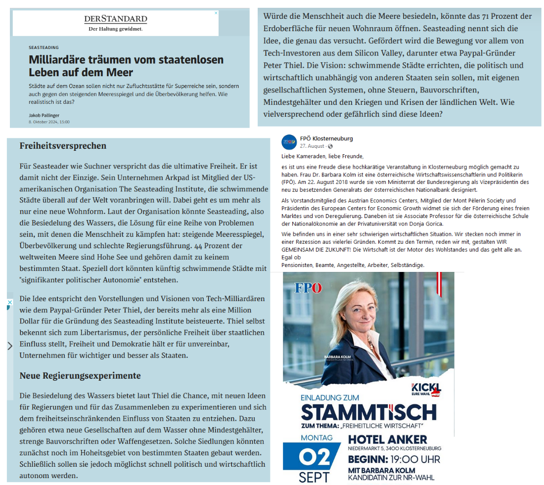 „Seasteading“ erinnert sehr an die „Wirtschaftszonen“, wie diese in Honduras hätten werden sollen, von denen in den philosophisch bestiegenen österreichischen Bergen heute noch so geschrieben wird, wie die Präsidentin es geschrieben recht gern lesen wird, sie, also B. K. sei die „Vorsitzende des Board of Trustees von ZEDE, Honduras, einer NGO für die Etablierung von Wirtschaftszonen zur Schaffung von Arbeitsplätzen.“