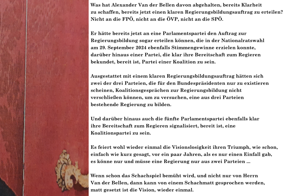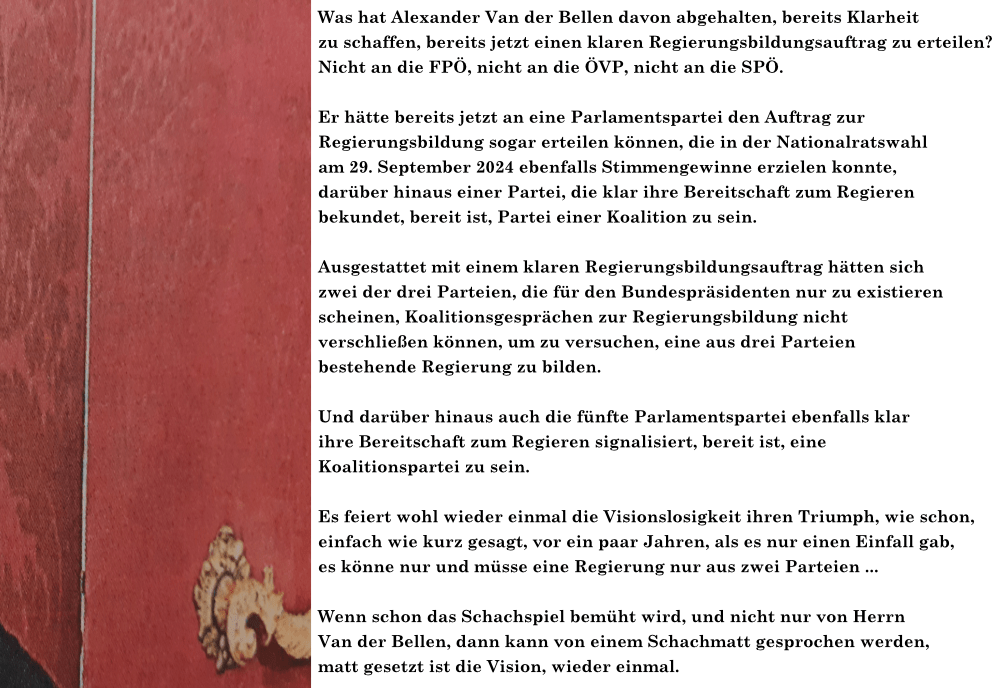 Es feiert wohl wieder einmal die Visionslosigkeit ihren Triumph, wie schon, einfach wie kurz gesagt, vor ein paar Jahren, als es nur einen Einfall gab, es könne nur und müsse eine Regierung nur aus zwei Parteien … Wenn schon das Schachspiel bemüht wird, und nicht nur von Herrn Van der Bellen, dann kann von einem Schachmatt gesprochen werden, matt gesetzt ist die Vision, wieder einmal.