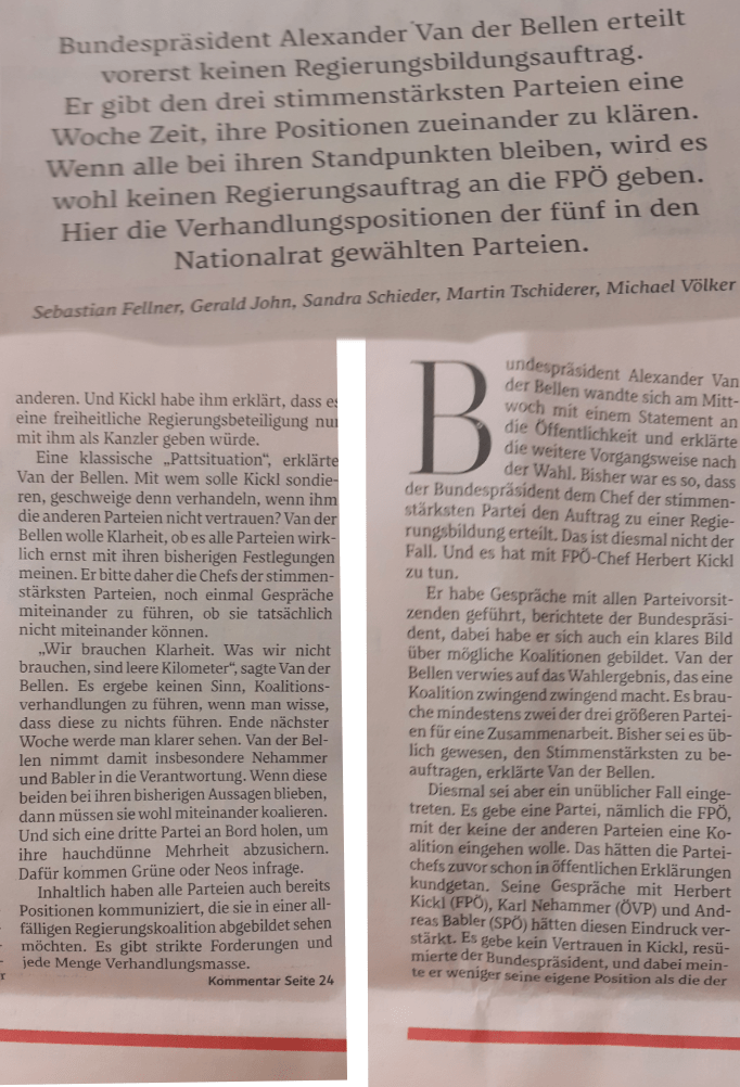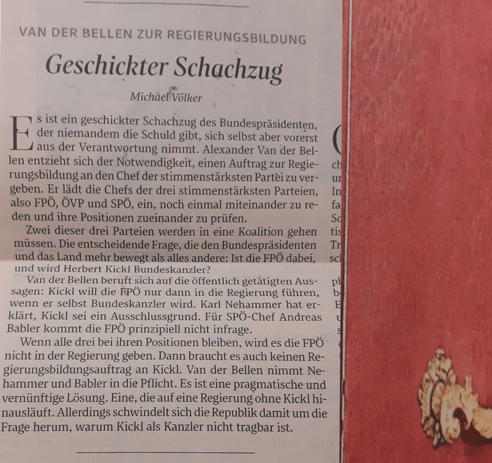 PS Es sei, schreibt Michael Völker in der Tageszeitung des österreichischen Medienstandards, am 10. Oktober 2024, ein geschickter Schachzug des Bundespräsidenten, der niemanden die Schuld gibt, sich selbst aber vorerst aus der Verantwortung nimmt. Geschickt mag es sein, aber es ist kein geschickter Schachzug, sondern ein Österreichzug, von einem Zug zum nächsten Zug, von einem Tag zum nächsten Tag sich zu hanteln, es gibt dafür, wenn es richtig in Erinnerung ist, eine kürzere Formulierung, mit nur einem Wort: Weiterwursteln.