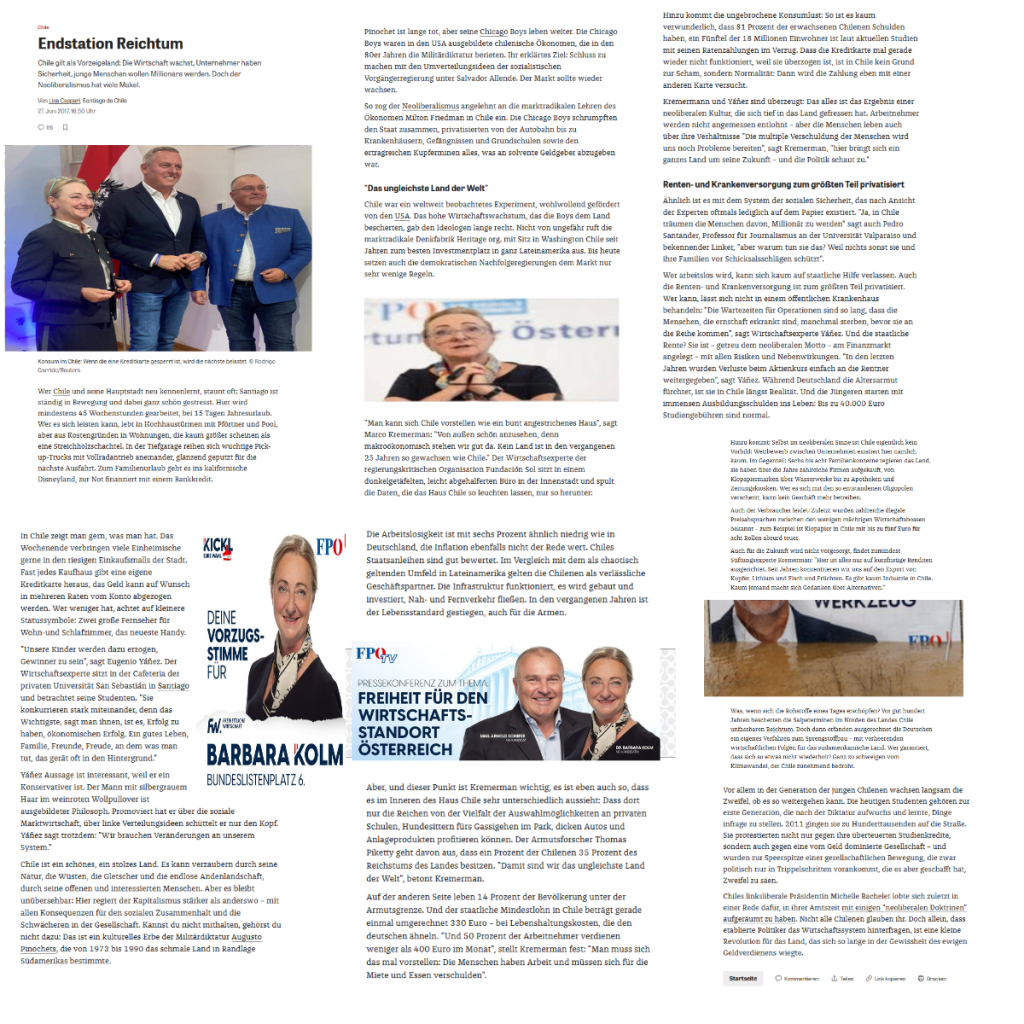 Wer arbeitslos wird, kann sich kaum auf staatliche Hilfe verlassen. Auch die Renten- und Krankenversorgung ist zum größten Teil privatisiert. Wer kann, lässt sich nicht in einem öffentlichen Krankenhaus behandeln: „Die Wartezeiten für Operationen sind so lang, dass die Menschen, die ernsthaft erkrankt sind, manchmal sterben, bevor sie an die Reihe kommen“, sagt Wirtschaftsexperte Yáñez. Und die staatliche Rente? Sie ist – getreu dem neoliberalen Motto – am Finanzmarkt angelegt – mit allen Risiken und Nebenwirkungen. „In den letzten Jahren wurden Verluste beim Aktienkurs einfach an die Rentner weitergegeben“, sagt Yáñez. Während Deutschland die Altersarmut fürchtet, ist sie in Chile längst Realität. Und die Jüngeren starten mit immensen Ausbildungsschulden ins Leben: Bis zu 40.000 Euro Studiengebühren sind normal. („Endstation Reichtum“. „Zeit“, 27. 6. 2016)