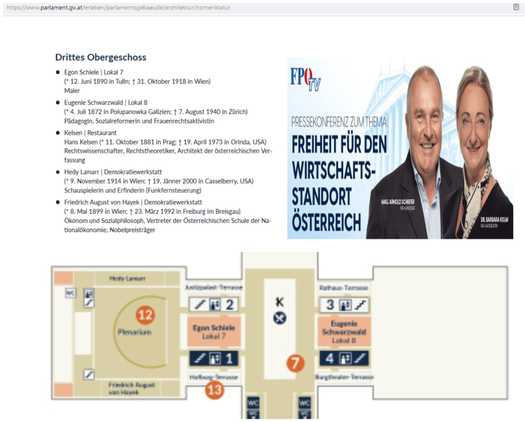 Von Hayek möchte K. nicht sprechen, gleich mahnt sie ein: „Zurück zum Thema“. Und das ist zu verstehen. Und das ist zugleich nicht zu verstehen. Gerade in Österreich ist es nicht anrüchig, zu Hayek zu stehen, erst vor kurzem hat der Präsident einen Gang im österreichischen Parlament Hayek gewidmet, und wie passend im Parlamentsplan beschrieben: „Friedrich August von Hayek | Demokratiewerkstatt“ …