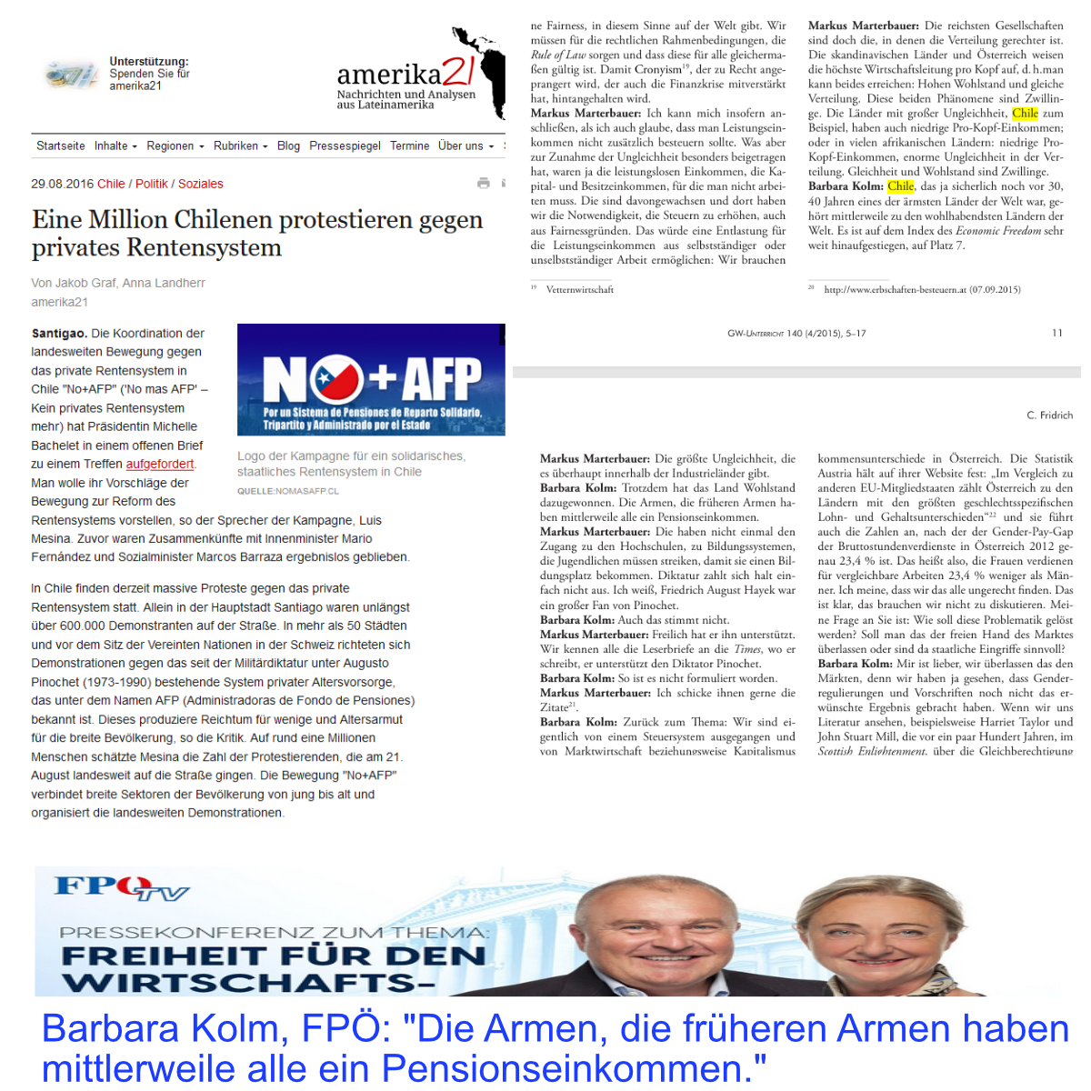 Und K. bekräftigt ihre Antwort mit dem Hinweis, die „früheren Armen“ hätten „mittlerweile alle ein Pensionseinkommen“ … Wie es darum bestellt ist, in Chile … Es könnte viel zu Chile hier geschrieben werden, aber wenn Sie selbst über Chile lesen, werden Sie rasch die Redlichkeit der K. erkennen.