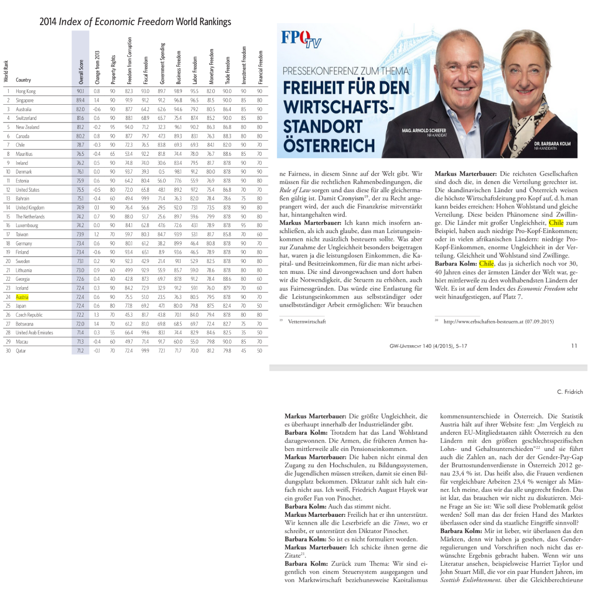K. antwortet mit dem Verweis auf den „Index des Economic Freedom“. Österreich wird in diesem Index von 2014 auch angeführt, auf dem Platz 24, also ganze 17 Plätze hinter Chile. Um was für einen Index es sich dabei handelt, offenbart bereits sein Titel: Index der ökonomischen Freiheit … Nach diesem Index wären wohl die „Wirtschaftszonen“ in Honduras, bei der K. eine treibend führende Kraft spielte, wären sie nicht gestoppt worden, unangeforchten und mit einem recht extrem großen Vorsprung mit einhundert Punkten auf Platz 1 vor der Zweitplazierten. Der Index der ökonomischen Freiheit bewertet nicht nur Staaten. Denn die Zweitplazierte von 2014 ist kein Staat, sondern eine „Sonderverwaltungszone“ – Hong Kong. Ks „Wirtschaftszonen“ wären wohl sofort mit Begeisterung in diesen Index aufgenommen und an die erste Stelle gesetzt und als Vorbild ökonomischer Freiheit in die Auslage gestellt worden, wenn diese nicht …