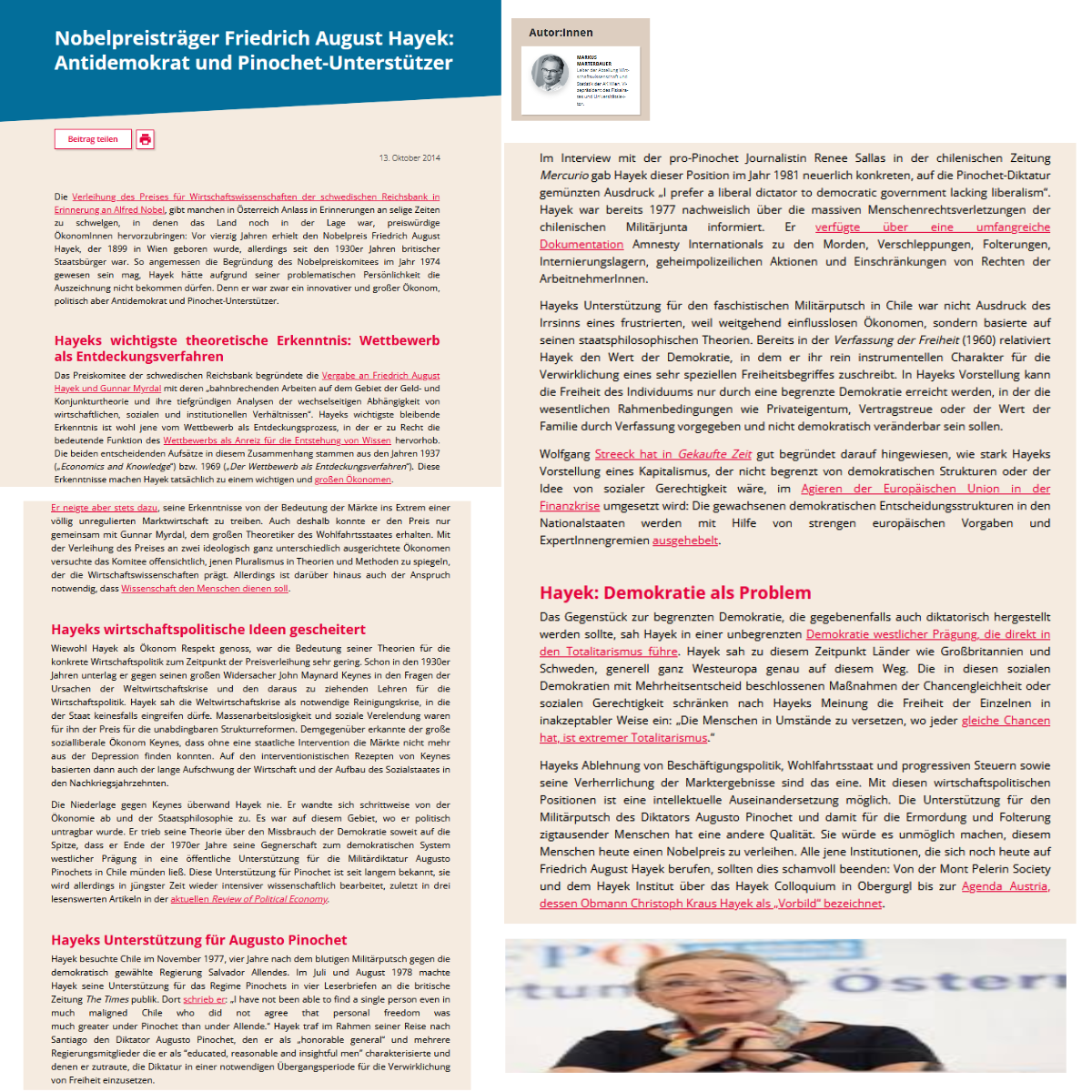 Hayeks Ablehnung von Beschäftigungspolitik, Wohlfahrtsstaat und progressiven Steuern sowie seine Verherrlichung der Marktergebnisse sind das eine. Mit diesen wirtschaftspolitischen Positionen ist eine intellektuelle Auseinandersetzung möglich. Die Unterstützung für den Militärputsch des Diktators Augusto Pinochet und damit für die Ermordung und Folterung zigtausender Menschen hat eine andere Qualität. Sie würde es unmöglich machen, diesem Menschen heute einen Nobelpreis zu verleihen. Alle jene Institutionen, die sich noch heute auf Friedrich August Hayek berufen, sollten dies schamvoll beenden: Von der Mont Pelerin Society und dem Hayek Institut über das Hayek Colloquium in