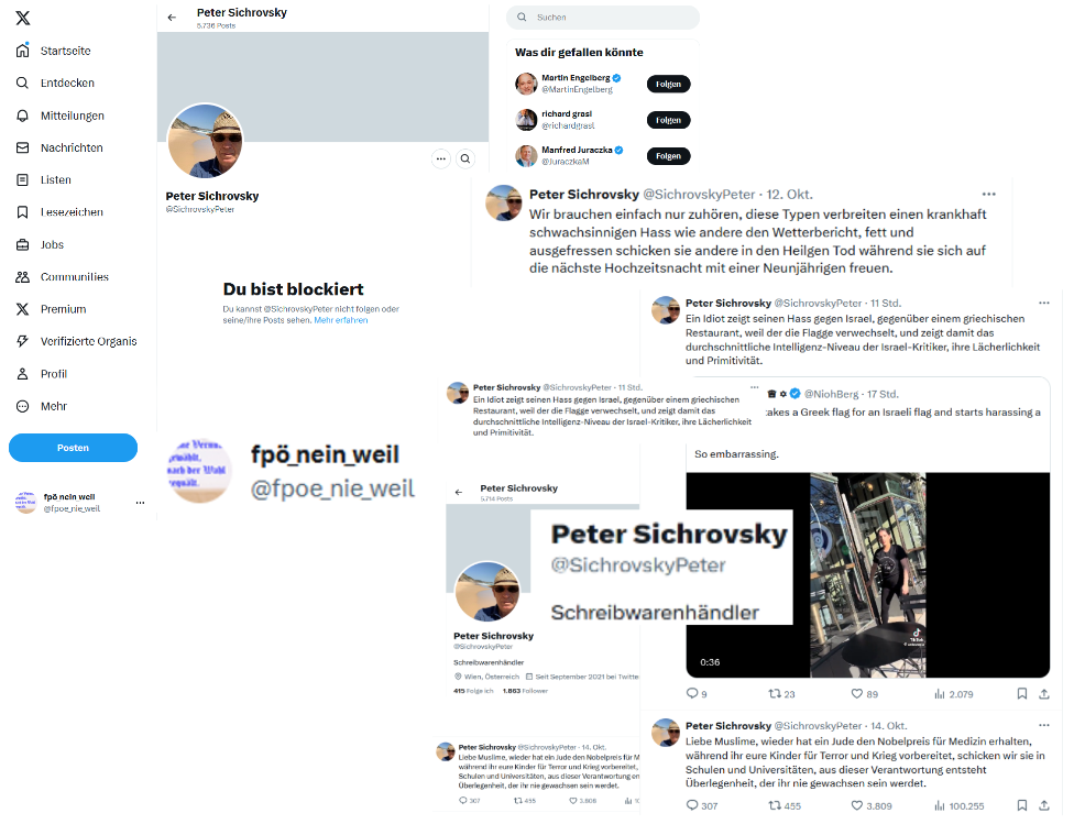 fpö-nein-weil wird von Peter Sichrovsky blockiert, wird an diesem 19. Oktober ’24 mitgeteilt, und das kann gut verstanden werden, gab es doch schon zu den Zeiten, als Peter Sichrovsky für diese Parlamentspartei seinen Stuhl bekam, als Generalseketrär und als Abgeordneter dieser Parlamentspartei, genügend Gründe für ein Nein zu dieser Partei,