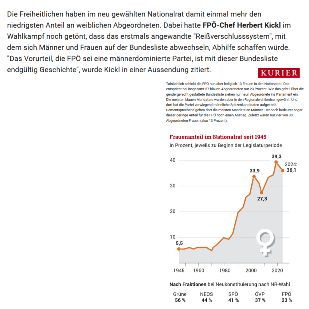 Tatsächlich schickt [seine Partei] nun aber lediglich 13 Frauen in den Nationalrat. Das entspricht bei insgesamt 57 blauen Abgeordneten nur 23 Prozent.