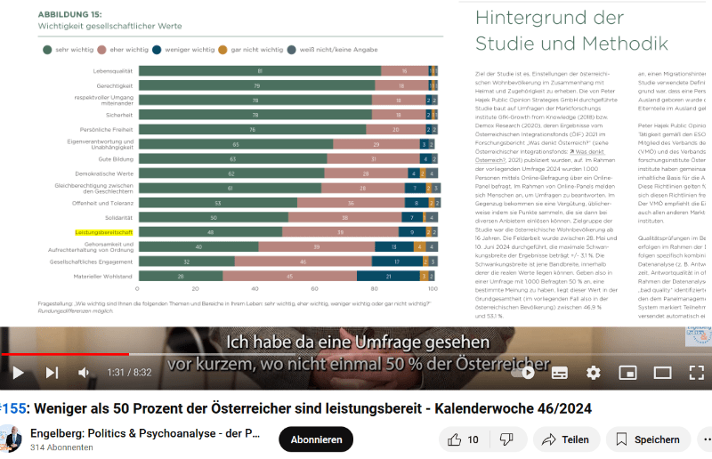 Welchen Stellenwert diese von ihm geseheen Werte in Österreich tatsächlich haben, kann beispielsweise in diesen zwei oben genannten Umfragen ebenfalls gelesen werden, wie den zwei Abbildungen zu entnehmen ist. Kurz zusammengefaßt: weder eine Erosion, wie sie Engelberg sieht, der Leistungsbereitschaft noch eine Erosion, wie sie Engelberg sieht, der Werte.