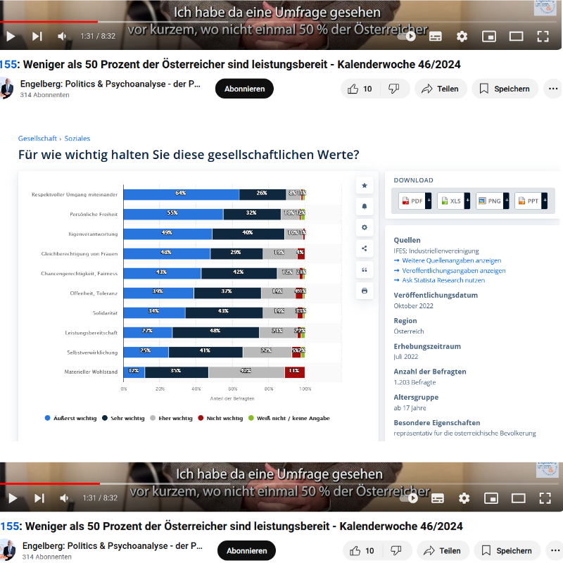 Welchen Stellenwert diese von ihm geseheen Werte in Österreich tatsächlich haben, kann beispielsweise in diesen zwei oben genannten Umfragen ebenfalls gelesen werden, wie den zwei Abbildungen zu entnehmen ist. Kurz zusammengefaßt: weder eine Erosion, wie sie Engelberg sieht, der Leistungsbereitschaft noch eine Erosion, wie sie Engelberg sieht, der Werte.