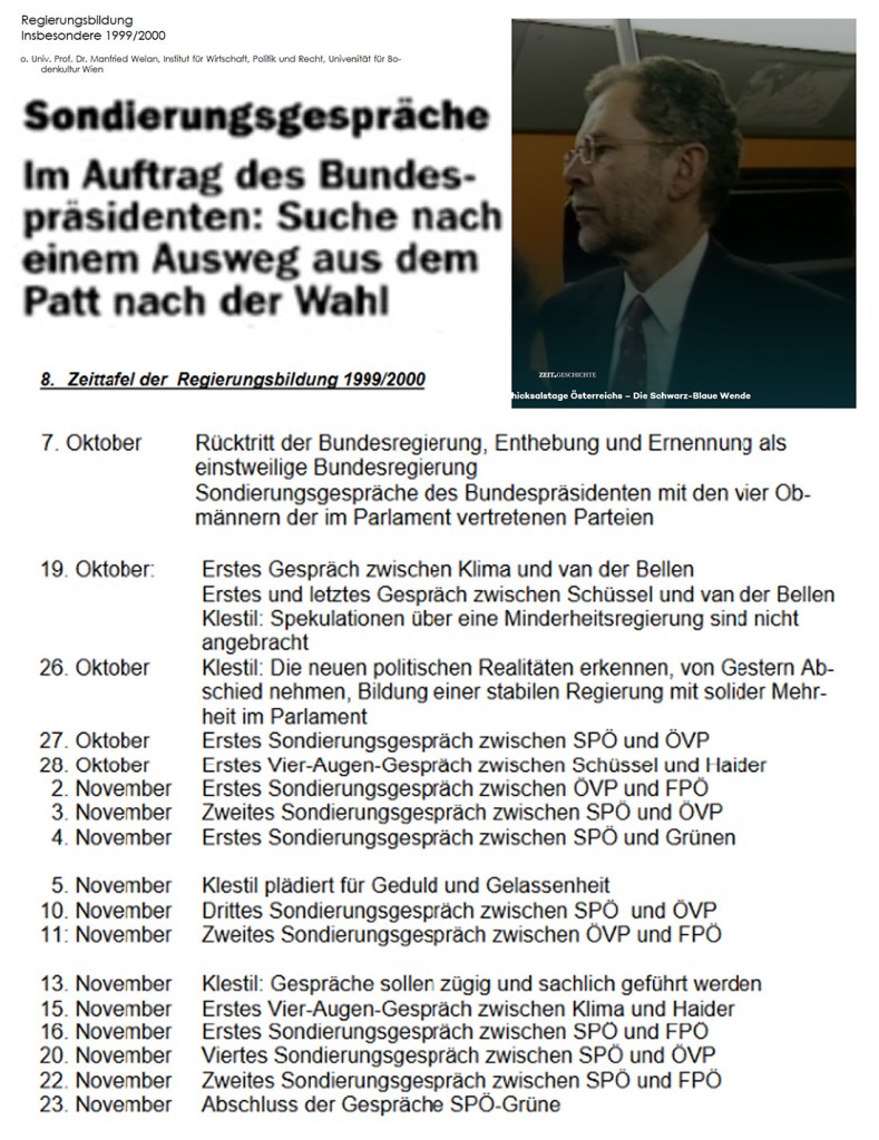 Das war vor fünfundzwanzig Jahren. Wird in der Fernsehdokumentation „Schicksalstage Österreichs -Die schwarz-blaue Wende“ am 16. November 2024 berichtet. Nicht Alexander Van der Bellen, sondern Thomas Klestil war Bundespräsident.