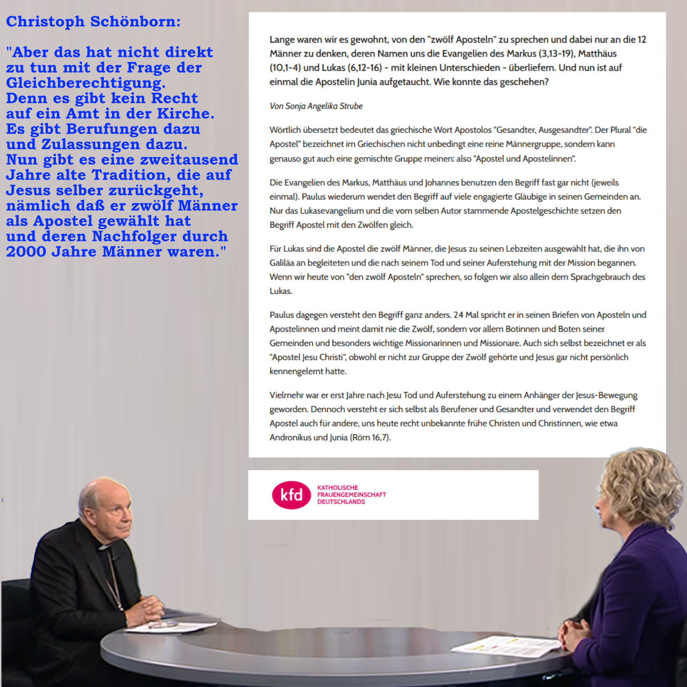 Christoph Schönborn: Ich kenne persönlich eine ganze Reihe Frauen, auch wirklich befreundet, die von sich sagen, ich habe eine Berufung zur Priesterin, zur Diakonin. Ich kann nur sagen, das akzeptiere ich und ich halte das für etwas Schönes und Starkes. Aber das hat nicht direkt zu tun mit der Frage der Gleichberechtigung. Denn es gibt kein Recht auf ein Amt in der Kirche. Es gibt Berufungen dazu und Zulassungen dazu. Nun gibt es eine zweitausend Jahre alte Tradition, die auf Jesus selber zurückgeht, nämlich daß er zwölf Männer als Apostel gewählt hat und deren Nachfolger durch 2000 Jahre Männer waren. Jetzt kann man darüber diskutieren, ist das patriarchalisch, woher kommt das, warum ist das so. Eines ist für mich klar, eine Änderung dieser Vorgabe, die für die katholische Kirche eine Vorgabe, die auf Jesus zurückgeht, ist, das kann nur ein ökumenisches Konzil entscheiden. Das kann nicht eine Synode, die obendrein keine Entscheidungsvollmacht hat, sondern Vorschläge an den Papst abstimmt, und dieser Vorschlag, Diakoninnen zu weihen, ist nicht formalisiert gewesen, sondern es war eine offene Frage.