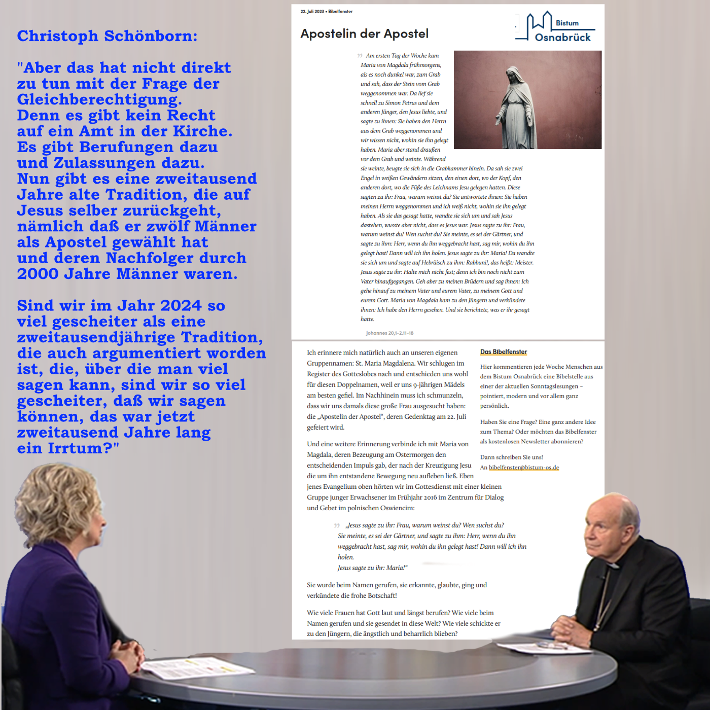 Barbara Tóth: Was sind denn die Gründe jetzt, wenn man quasi innerhalb der Kirche diskutiert, daß man sagt, wir sind noch nicht reif dafür, also was ist das schlagende Argument dagegen? Außer der Tradition und der 2000 Jahre, wo man es halt anders gemacht hat. Hat man Angst?