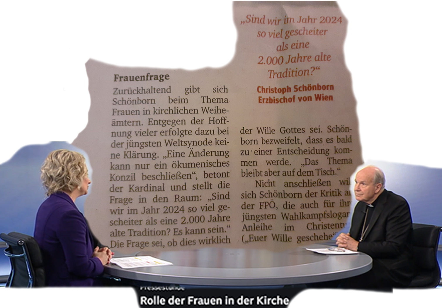 Barbara Tóth: Sie sprechen an den Priestermangel, Sie kennen jetzt sicher das Thema, nämlich die Frauenfrage. Auch das war auf der Weltsynode ein wichtiges Thema. Wir haben auch ein Bild vorbereitet, da sieht man deutsche selbsternannte Bischöfinnen, die stark dafür eintreten, daß auch Frauen ein Amt in der Kirche haben dürfen. Als Minimialziel haben viele gesehen, daß zumindest Ordensfrauen als Diakoninnen geweiht werden dürfen, in Zukunft. Auch das konnte nicht beschlossen werden. Wenn es nach Ihnen persönlich gegangen wäre, hätte man diesen Schritt wagen können?