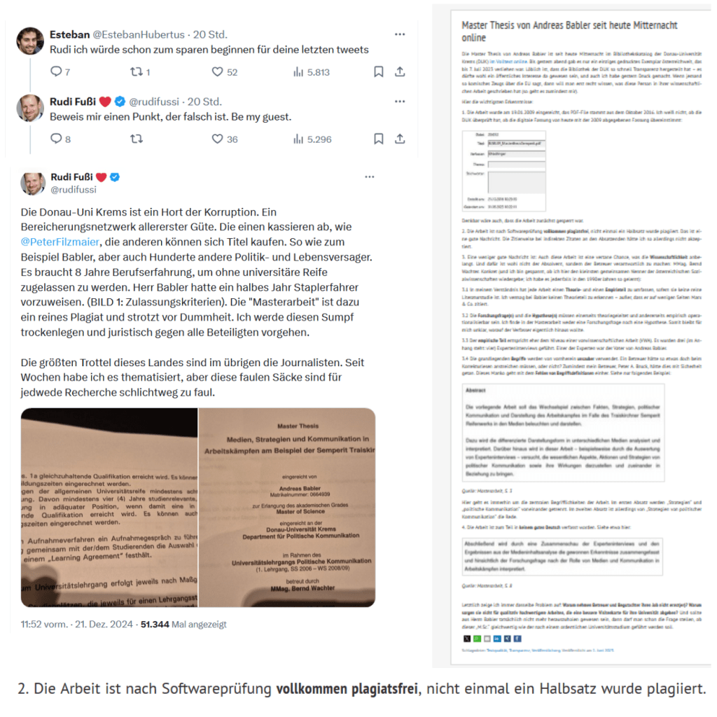 An „mehreren Universitäten und Fachhochschulen“ würde er, so allgemein läßt er es beschreiben, seine „Erfahrungen“ und sein „Fachwissen an Studierende“ weitergeben. Keine konkrete Universität läßt er nennen, keine konkrete Fachhochschule läßt er nennen. So könnte er, Rudi Fußi, auch an der Donau-Uni Krems seine „Erfahrungen“ und sein „Fachwissen“ … dafür würde auch sprechen, daß er gar viel über die Donau-Uni Krems weiß, wie er selbst am 21. Dezember 2024 auf der Konzernplattform X wissensreich —