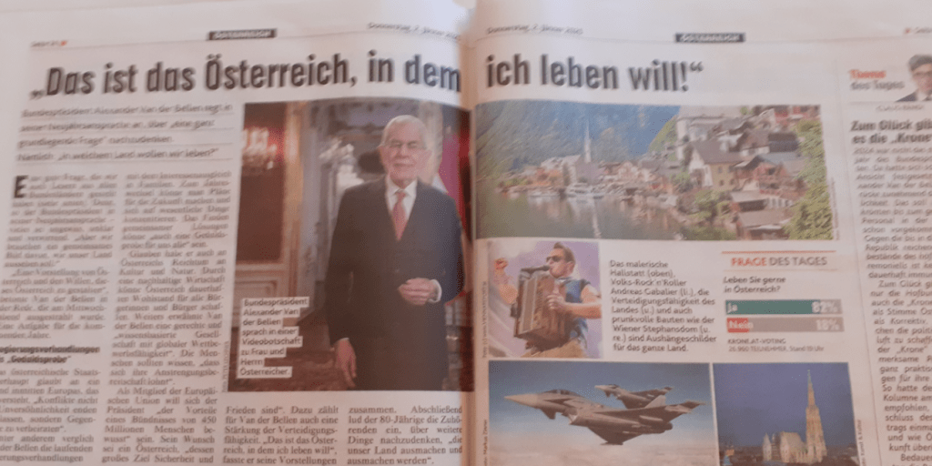 Das schreibt am Donnerstag, 2. Jänner 2025, die Tageszeitung „Neue Kronen Zeitung“, und viele, nein, alle, werden es so lesen, als hätte Bundespräsident Alexander Van der Bellen genau das gesagt, in seiner Neujahrsansprache am 1. Jänner 2025, das wird bleiben, er, Alexander Van der Bellen, würde in einem Land leben wollen, dessen „Aushängeschlilder
