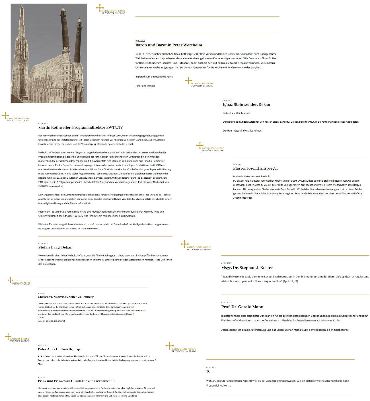 „Auch wenn viele, darunter die Katholische Aktion, den Stellungnahmen von Weihbischof Laun zu Lebensthemen der Menschen nicht immer folgen konnten, war sein Einsatz für den Lebensschutz doch beeindruckend“, hielt Mayer fest. Und weiter: „Laun war in seinen Äußerungen kompromisslos, als Seelsorger erlebten ihn viele als freundlich und verständnisvoll. Er kämpfte immer mit offenem Visier und war in gleichgesinnten Medien als Kolumnist gefragt, […] Der nun verstorbene Weihbischof habe die Wirkung über die Diözesangrenzen hinaus geliebt, so Mayer. Als bleibende Spuren Launs in Salzburg bezeichnete die KA-Präsidentin die „Erinnerungen an einen Bischof, der seinen Kampf für das Reich Gottes gekämpft hat und Sympathien durch seine Tierliebe zu Schäferhündin Pamina gewonnen hat“. […]