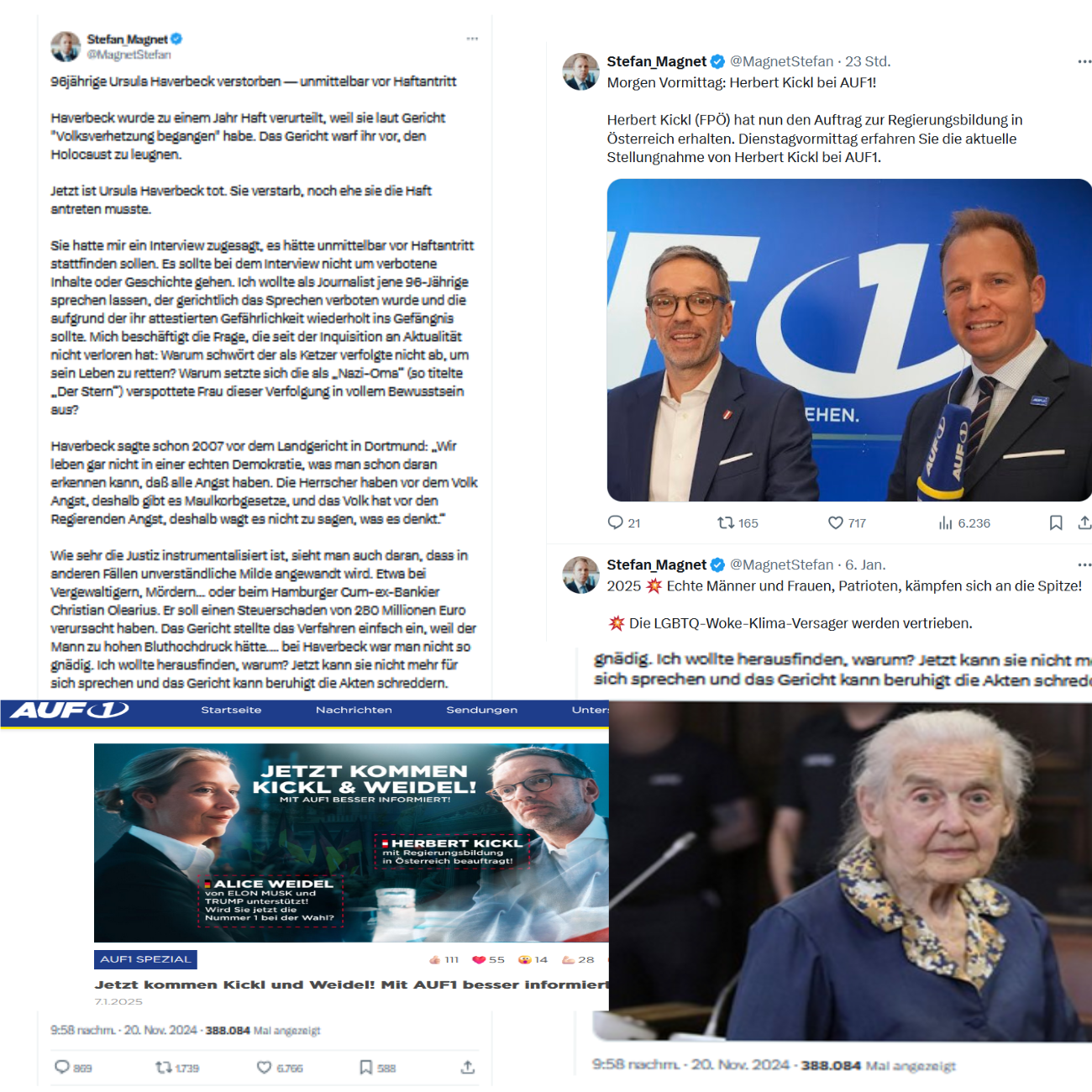 wie am 20. November 2024 auf der Konzernplattform X, gelesen heute am 7. Jänner 2025, Stefan Magnet in seinem Nachruf auf sie, Ursula Haverbeck, schreibt, in seinem Nachruf, der im Grunde ein Vorruf ist, geschrieben von ihm bereits am 28. Juni 2024, verbreitet ebenfalls auf der Konzernplattform X —
