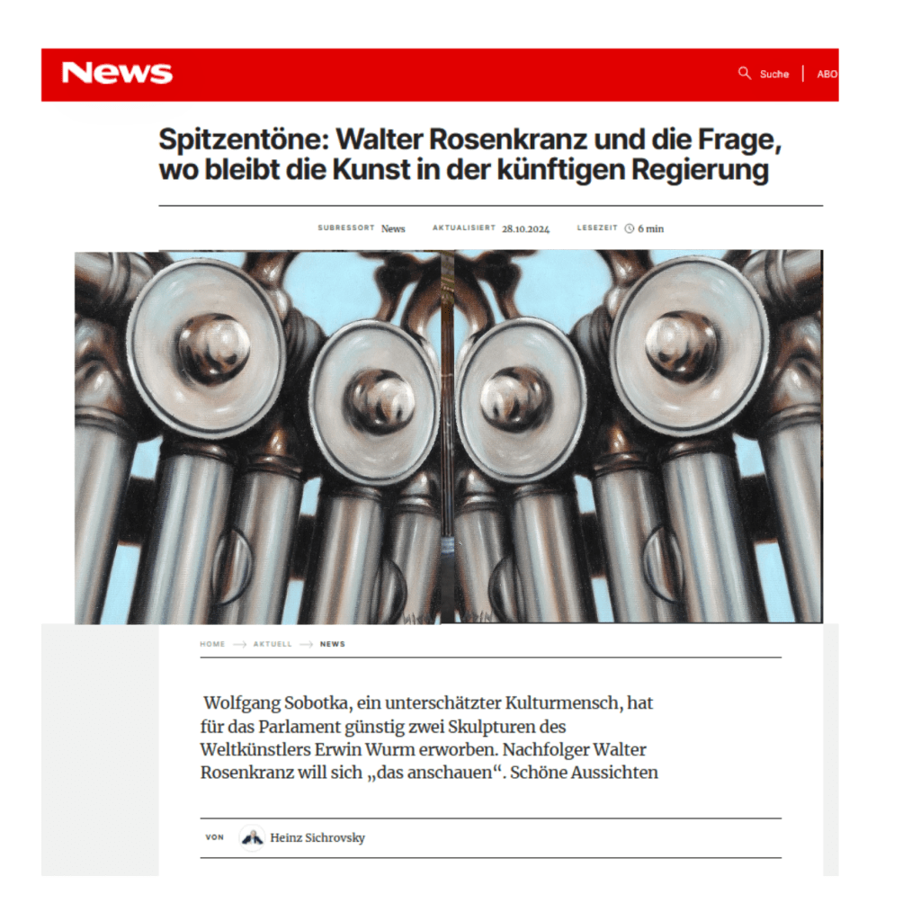 Und was für ein „Großbild wird ab Herbst ’25 „mit Magneten auf der Brandschutzwand fixiert“ werden? Eines, das der identitär geführten Bundesregierung gefällt? Und gesinnungsgemäß auch dem Präsidenten des Parlaments, der sich „als erste Amtshandlung anschauen will“, die Kunst, im Parlament, gefällt?