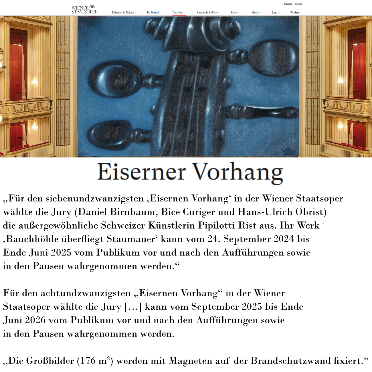 Was ab dem Herbst ’25 ansteht, in der Staatsoper Wien, ist die Gestaltung des „Eisernen Vorhangs“, ist doch »Bauchhöhle überfliegt Staumauer« von Pipilotti Rist nur mehr bis Ende Juni 2025 in der Wiener Staatsoper —