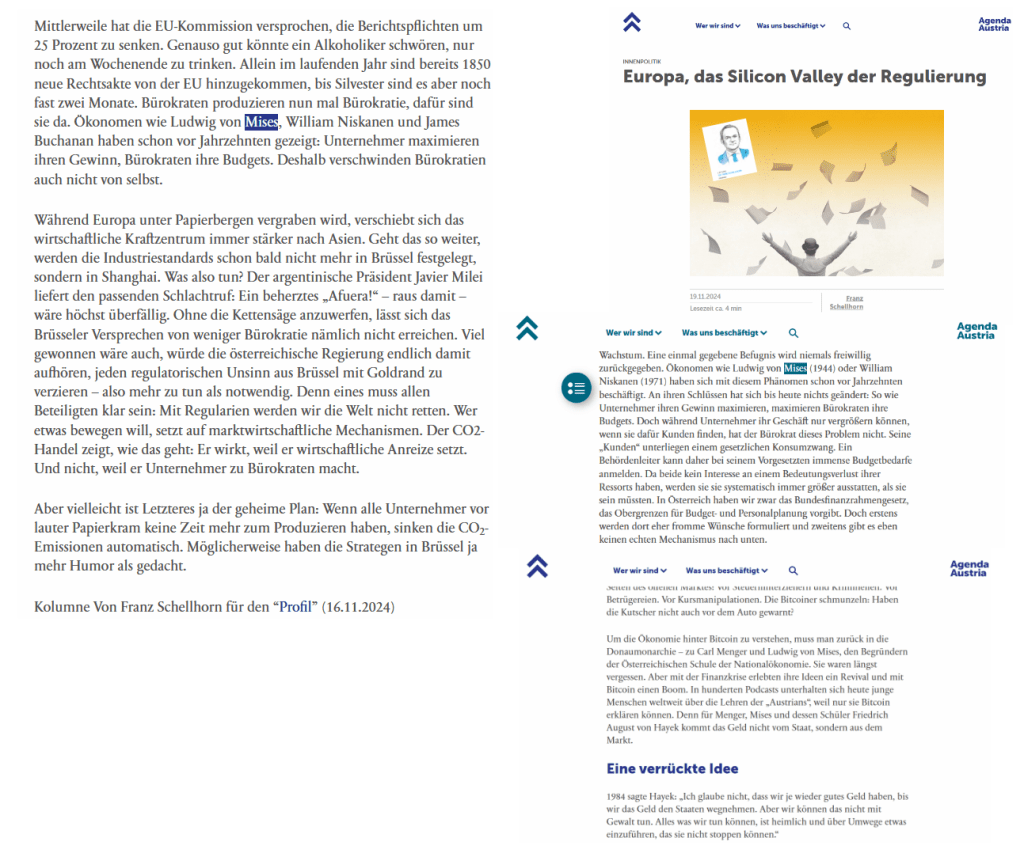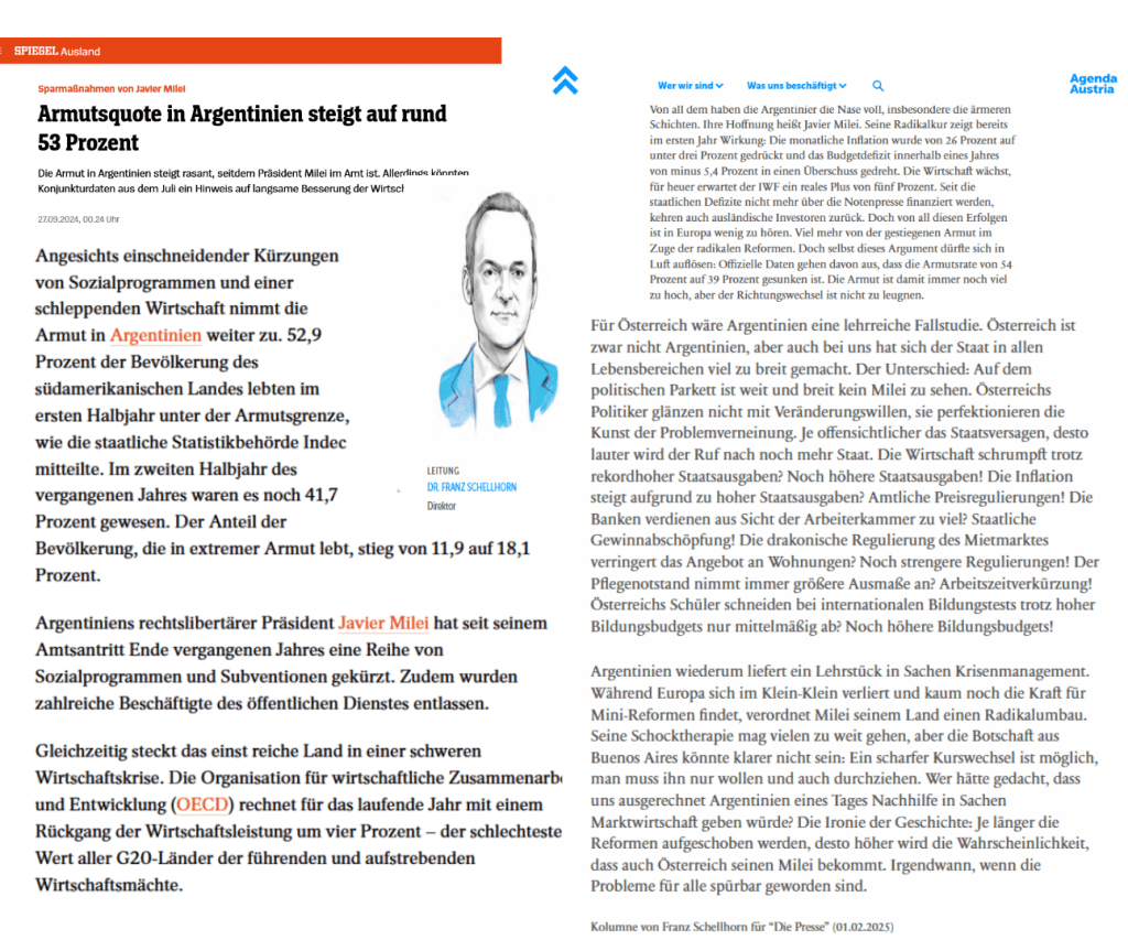 Javier Milei wird von ihr, der „Agenda Austria“, gefeiert, Milei, ihre Agenda für Austria. So am 4. Februar 2025, ist auf ihrer Website am 10. Februar 2025 zu lesen: