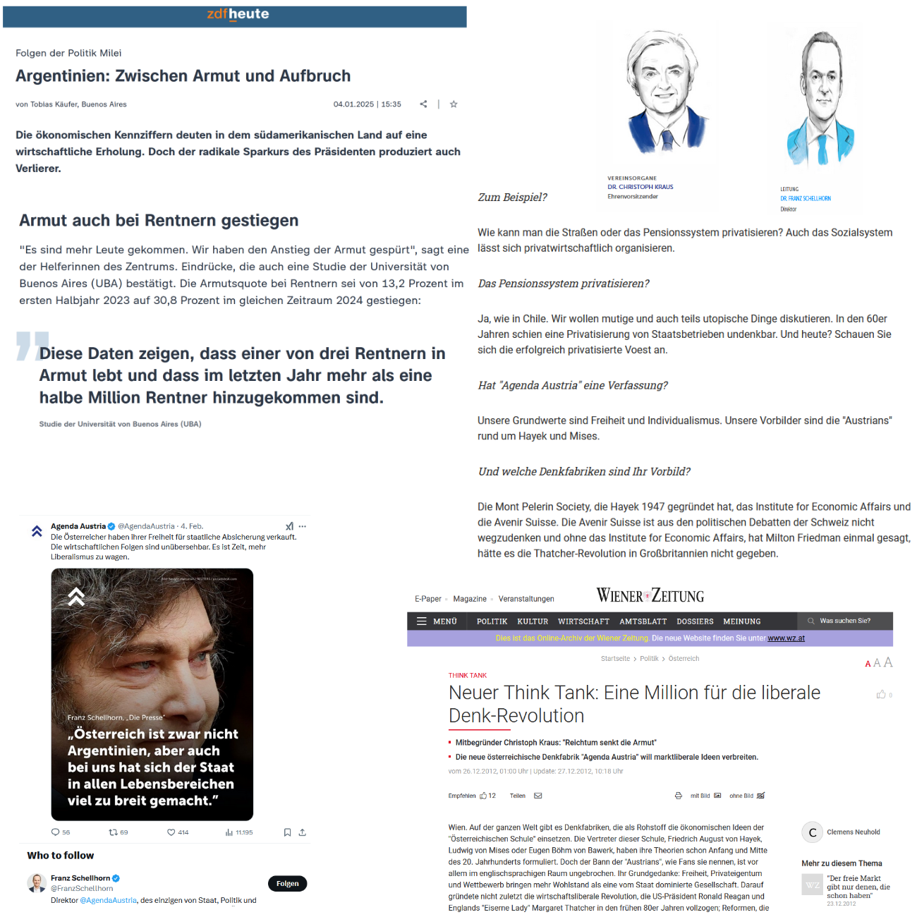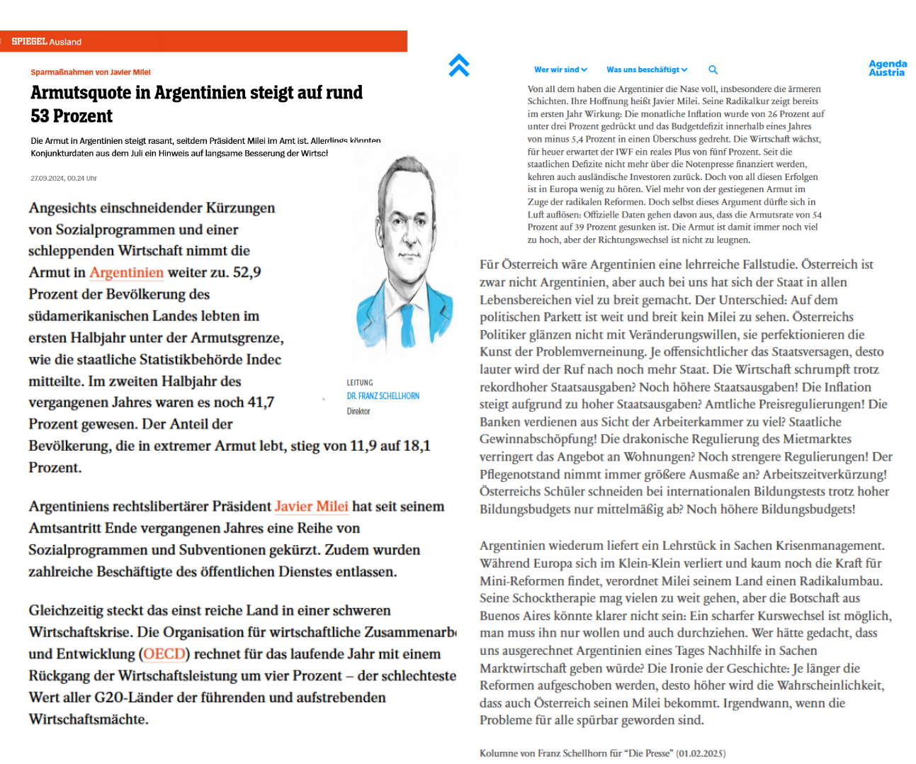 Javier Milei wird von ihr, der „Agenda Austria“, gefeiert, Milei, ihre Agenda für Austria. So am 4. Februar 2025, ist auf ihrer Website am 10. Februar 2025 zu lesen: