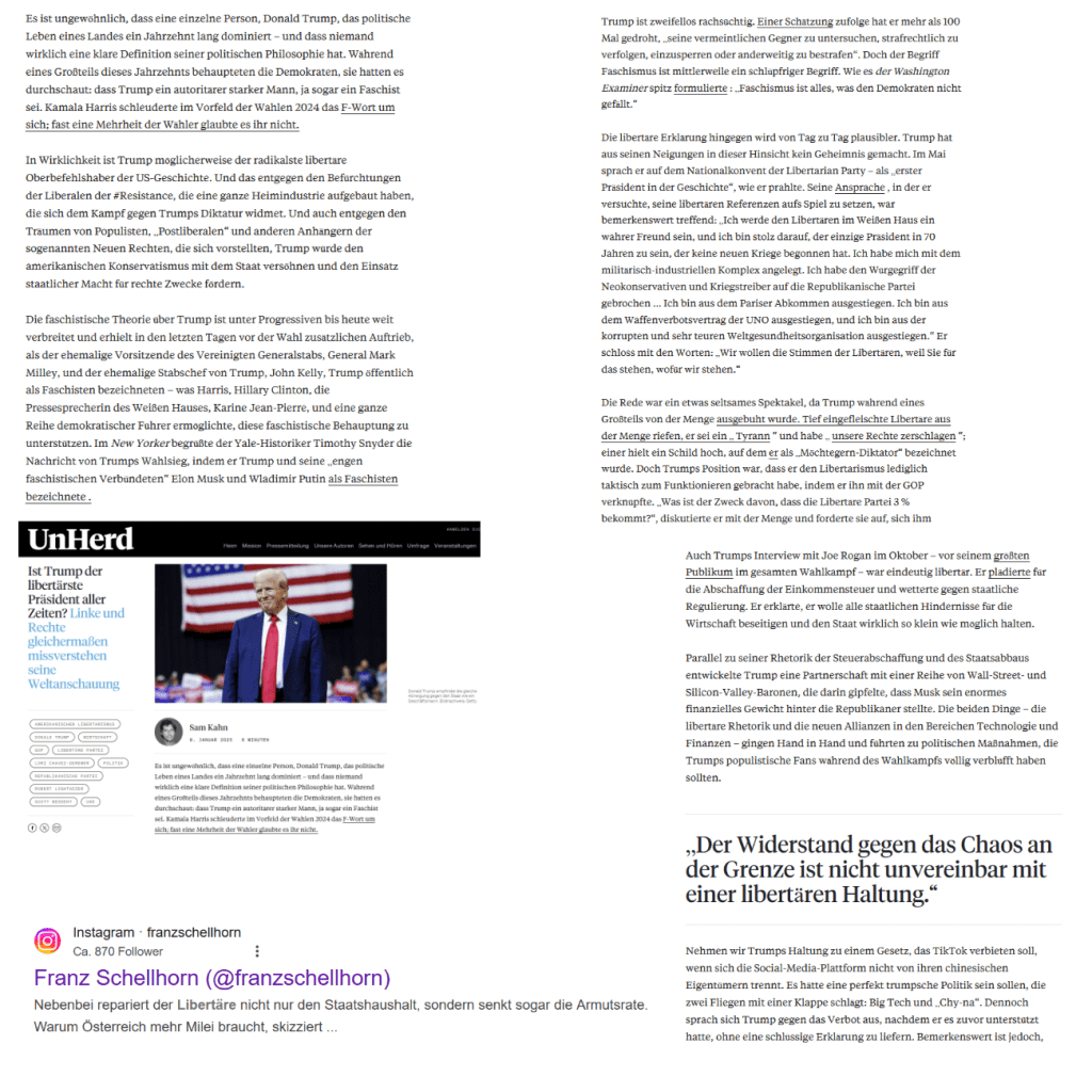 Wem sonst als einem „libertären Ökonomen“ kann ein Franz Schellhorn sonst zujubeln als einem derselben Gesinnung. Und dann gibt es noch einen „Präsidenten“, der sich seine Zujubelei erkauft —