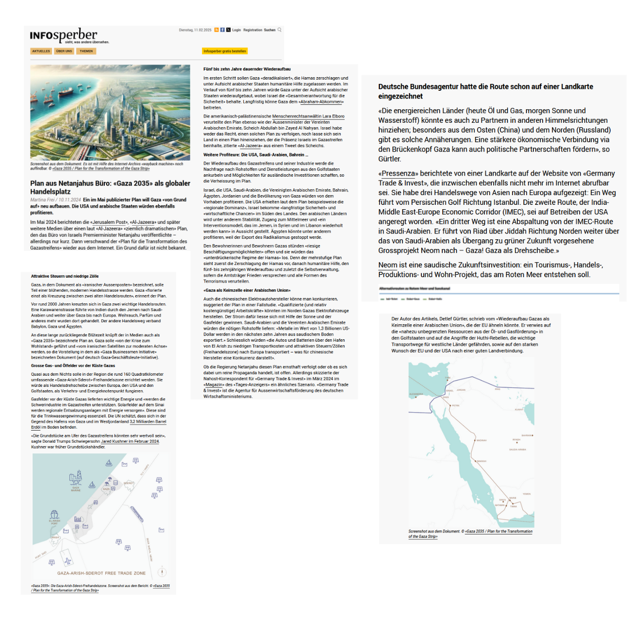 «Pressenza» berichtete von einer Landkarte auf der Website von «Germany Trade & Invest», die inzwischen ebenfalls nicht mehr im Internet abrufbar sei. Sie habe drei Handelswege von Asien nach Europa aufgezeigt: Ein Weg führt vom Persischen Golf Richtung Istanbul. Die zweite Route, der India-Middle East-Europe Economic Corridor (IMEC), sei auf Betreiben der USA angeregt worden. «Ein dritter Weg ist eine Abspaltung von der IMEC-Route in Saudi-Arabien. Er führt von Riad über Jiddah Richtung Norden weiter über das von Saudi-Arabien als Übergang zu grüner Zukunft vorgesehene Grossprojekt Neom nach – Gaza! Gaza als Drehscheibe.» Neom ist eine saudische Zukunftsinvestition: ein Tourismus-, Handels-, Produktions- und Wohn-Projekt, das am Roten Meer entstehen soll.