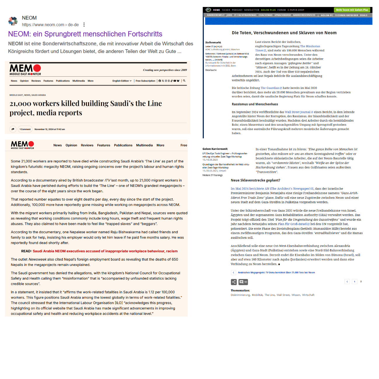 Laut einem Bericht der indischen, englischsprachigen Tageszeitung The Hindustan Times, sind mehr als 100.000 Menschen während des Baus von Neom verschwunden. Unter den derzeitigen Arbeitsbedingungen seien die Arbeiter nach eigenen Aussagen „gefangene Bettler“ und „Sklaven“, heißt es in der Zeitung am 28. Oktober 2024. Auch der Tod von über 650 nepalesischen Arbeitnehmern sei laut Nepals Behörde für Auslandsbeschäftigung weiterhin ungeklärt. Die britische Zeitung The Guardian hatte bereits im Mai 2020 darüber berichtet, dass mehr als 20.000 Menschen gewaltsam aus der Region vertrieben worden seien, damit die saudische Regierung Platz für Neom schaffen konnte.