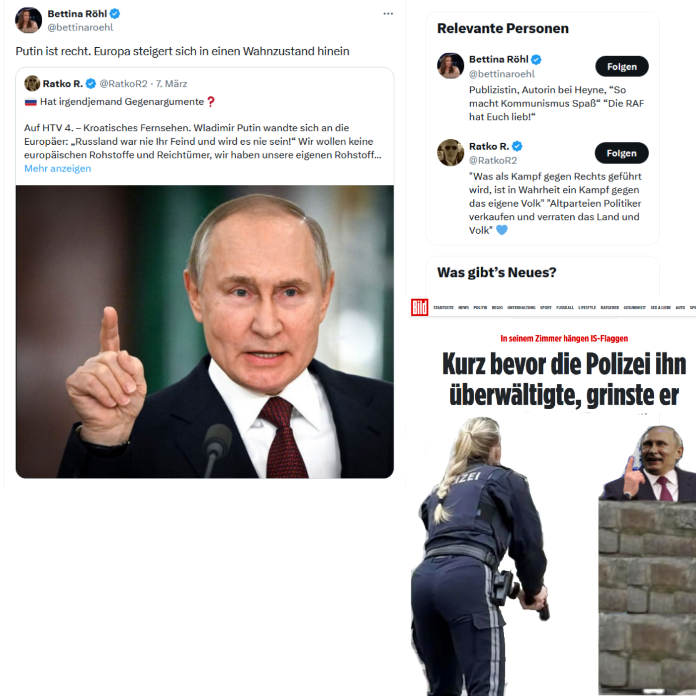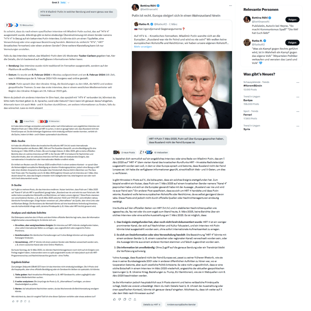 Bettina Röhl hätte sich das im kroatischen Fernsehen auch nicht anschauen können, weil sie den kroatischen Fernsehsender „HTV 4“ gar nicht gefunden hätte, den Ratko R. auf der Konzernplattform X am 7. März 2025 als Quelle für seine Verbreitung über die an die „Europäer“ gewandte Aussage von Vladimir Putin angibt, und von dem, Ratko R., Bettina Röhl es am 8. März 2025 übernimmt, weiter zu verbreiten, wobei sie, Bettina Röhl, zum Schluß kommt: „Putin ist recht.“