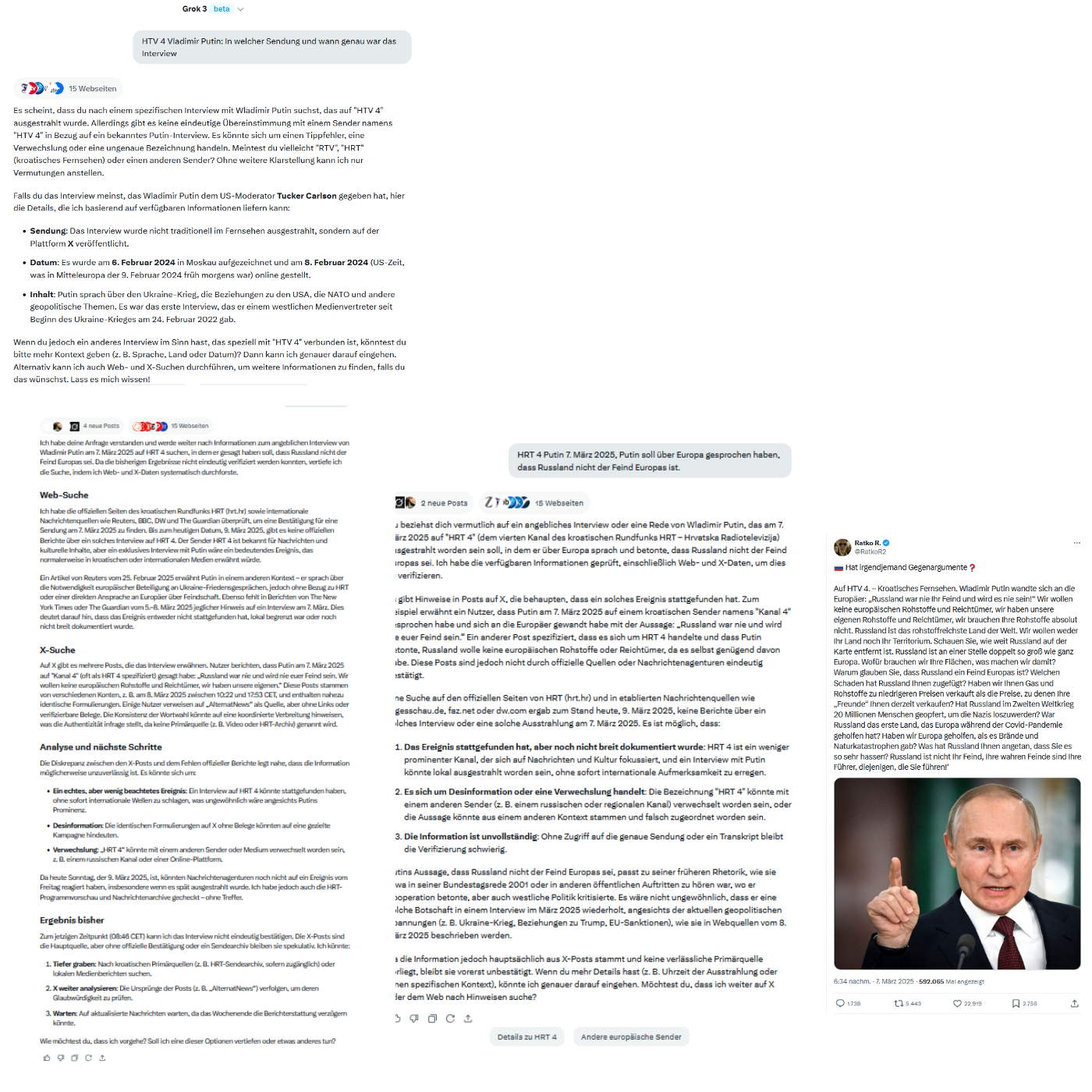 Ich habe deine Anfrage verstanden und werde weiter nach Informationen zum angeblichen Interview von Wladimir Putin am 7. März 2025 auf HRT 4 suchen, in dem er gesagt haben soll, dass Russland nicht der Feind Europas sei. Da die bisherigen Ergebnisse nicht eindeutig verifiziert werden konnten, vertiefe ich die Suche, indem ich Web- und X-Daten systematisch durchforste.