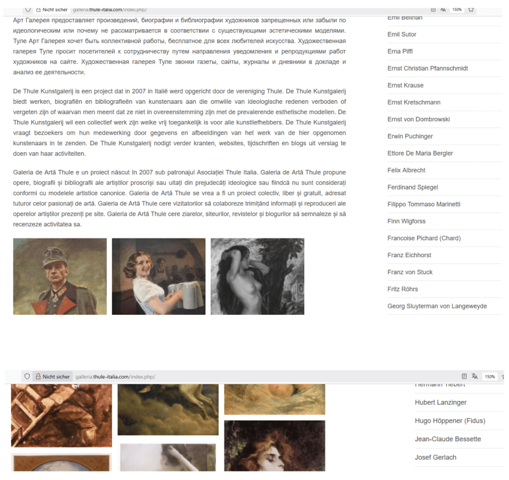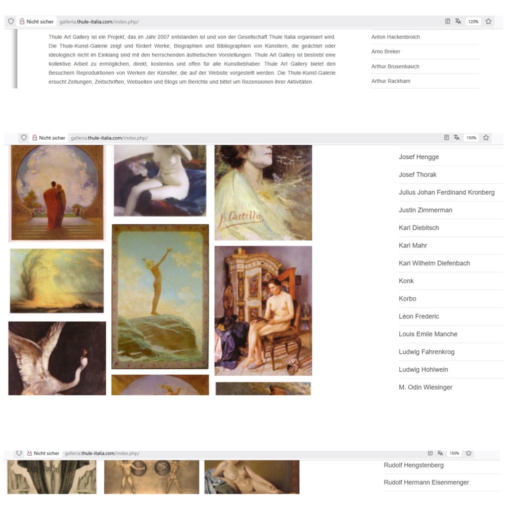 Thule Art Gallery ist ein Projekt, das im Jahr 2007 entstanden ist und von der Gesellschaft Thule Italia organisiert wird. Die Thule-Kunst-Galerie zeigt und fördert Werke, Biographien und Bibliographien von Künstlern, die geächtet oder ideologisch nicht im Einklang sind mit den herrschenden ästhetischen Vorstellungen. Thule Art Gallery ist bestrebt eine kollektive Arbeit zu ermöglichen, direkt, kostenlos und offen für alle Kunstliebhaber. Thule Art Gallery bietet den Besuchern Reproduktionen von Werken der Künstler, die auf der Website vorgestellt werden. Die Thule-Kunst-Galerie ersucht Zeitungen, Zeitschriften, Webseiten und Blogs um Berichte und bittet um Rezensionen ihrer Aktivitäten.