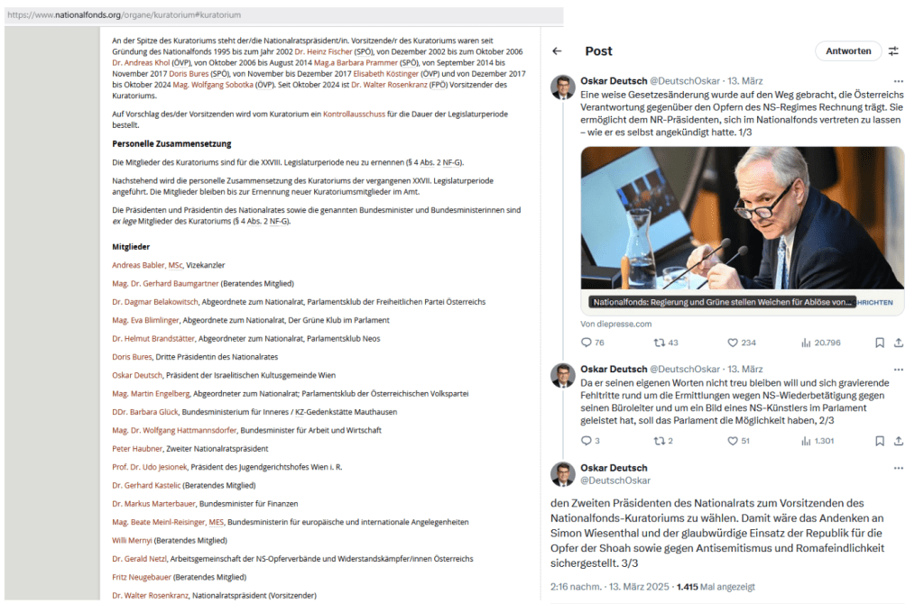 Statt dem Ehemaligen sitzt im Kuratorium des Nationalfonds, wie heute am 14. März 2025 gelesen werden darf, Dagmar Belakowitsch, eine Kameradin des Vorsitzenden Rosenkranz, die wie er als Nationalratspräsident, das er bleiben kann, so lange er und seine Parlamentspartei es will, sie gemäß den weisen Usancen im Parlament des Landes gewählt wird, deren „Verantwortung“ für ihre Landpartei es ist: