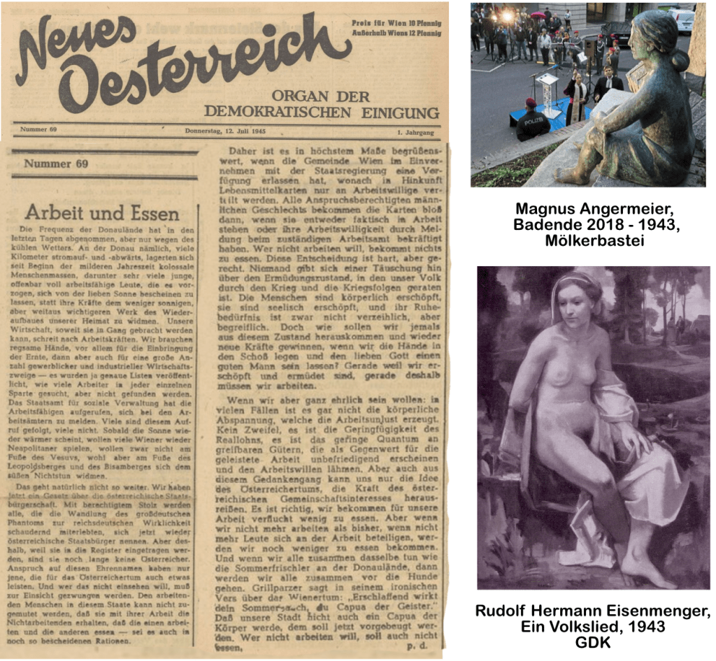Das ist am 12. Juli 1945 in „Neues Österreich“ zu lesen, und das wird am 28. März 2025 auch vom „Standard“ zitiert, im Artikel: „Nachkriegsmythos – Wie zu Arbeit verpflichtete Ex-Nazis zum Narrativ der „Trümmerfrauen“ wurden – In Wien mussten ehemalige NSDAP-Mitglieder Arbeitsdienst leisten, um die Stadt wieder aufzubauen. Die stigmatisierte Arbeit wurde zum neuen Opfermythos gesponnen“. Am Ende des Artikels „Arbeit und Essen“ in „Neues Österreich“ vom 12. Juli 1945 wird Franz Grillparzer zitiert, auf diesen offenbar aus dem Gedächtnis zitierten Vers wird noch zu sprechen zu kommen sein.