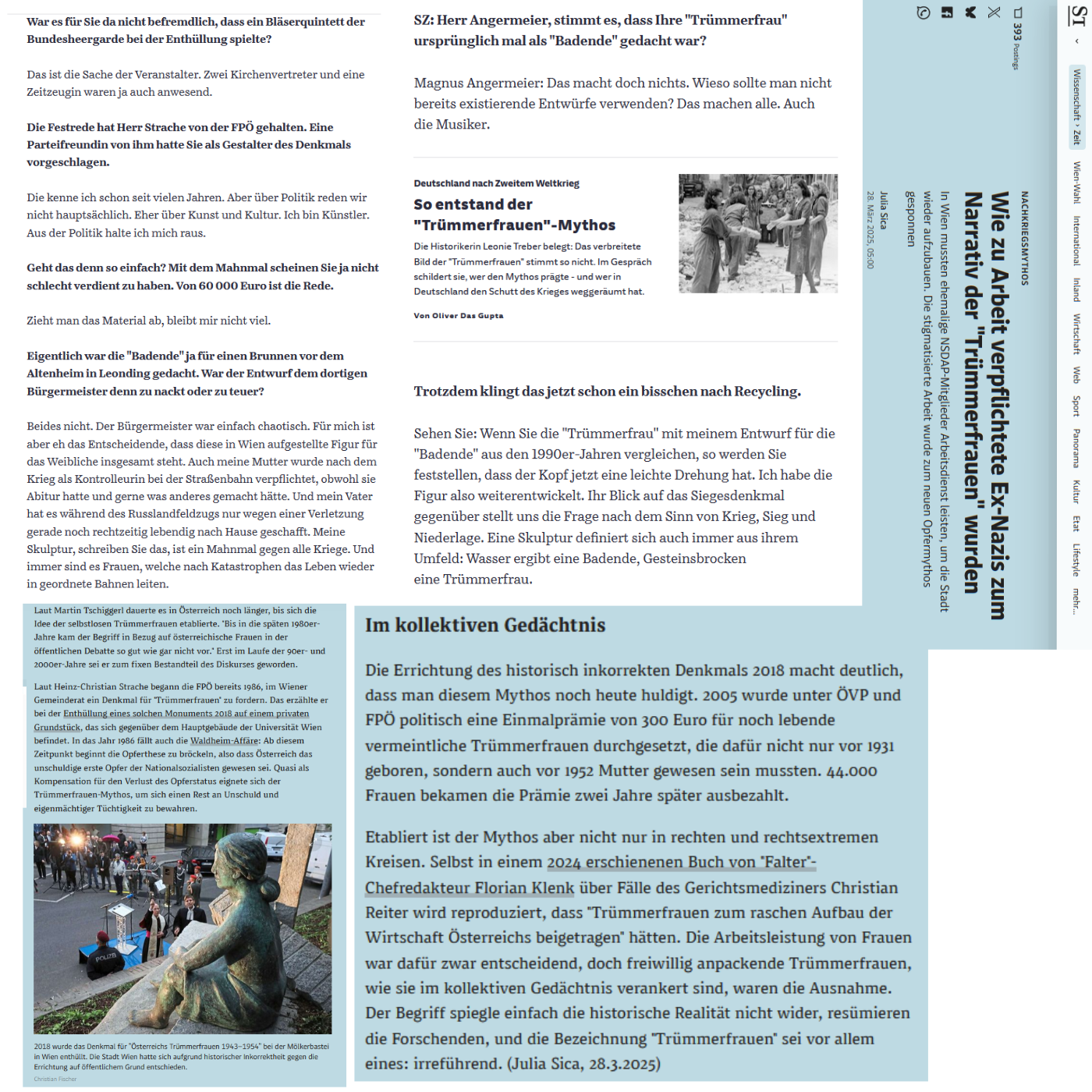 Es hat Magnus Angermeier nicht bedacht, daß er mit seiner Badenden auf der Mölker Bastei der Geschichte eine richtige Statue hinsetzte, und nicht bedacht hat seine Auftraggeberin, mag sie noch so sehr die Geschichte nach ihrer Gesinnung umzuschreiben bemüht sein wollen, in der Umschreibung der Geschichte offenbart sich die Geschichte doch immer wieder selbst, gegen ihre Umschreibenden … auch das Beispiel der Steinblöcke mit Badender auf der Mölker Bastei wieder einmal —