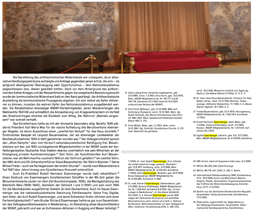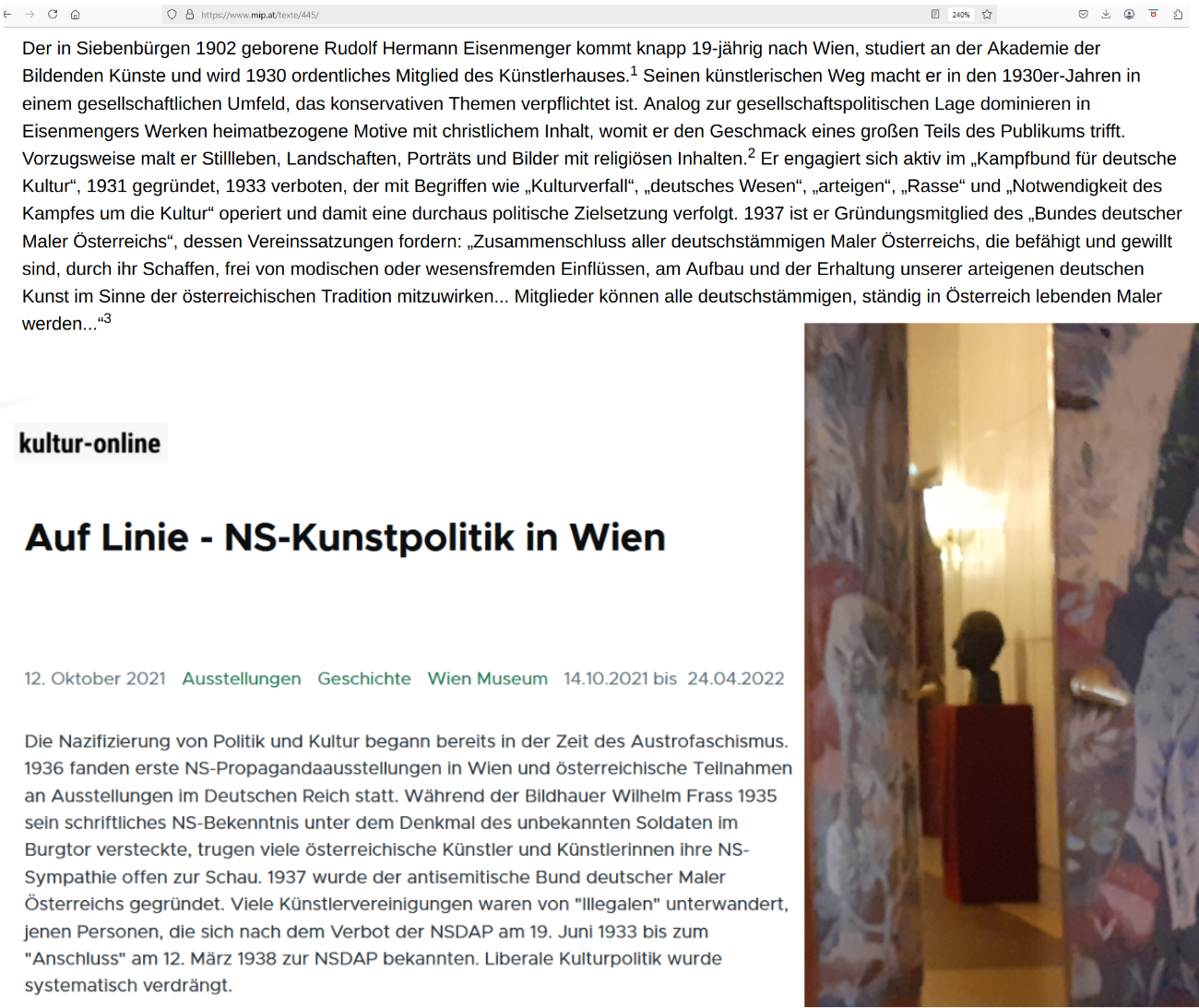 1944 schreibt Eisenmenger an den Reichsstatthalter von Wien, Baldur von Schirach: „Als Vorsitzender der Gesellschaft der bildenden Künstler Wiens, Künstlerhaus, melde ich Ihnen den Beschluss des Vorstandes der Gesellschaft: Wir erklären unsere glühende Bereitschaft, dem Führer und dem Vaterlande in der entscheidenden Phase des Lebenskampfes unseres Volkes jeden in unseren Kräften liegenden Dienst zu leisten. Da der Reichsbeauftragte für den totalen Kriegseinsatz alle Kreise des Volkes zum Einsatz aufgerufen hat, zögern wir Künstler nicht, diesem Ruf zu folgen. Wir wollen in Gemeinschaftsarbeit unsere Kraft und unser Gesellschaftshaus dem Auftrage zur Verfügung halten, der uns die unseren Fähigkeiten entsprechende Mitwirkung an der Rüstung unserer Helden an der Front zuweist, sofern wir nicht als Soldaten eingesetzt werden können…“9 Kurze Zeit später wird der Betrieb des Künstlerhauses eingestellt und ein Rüstungsbetrieb in den Räumen errichtet.10