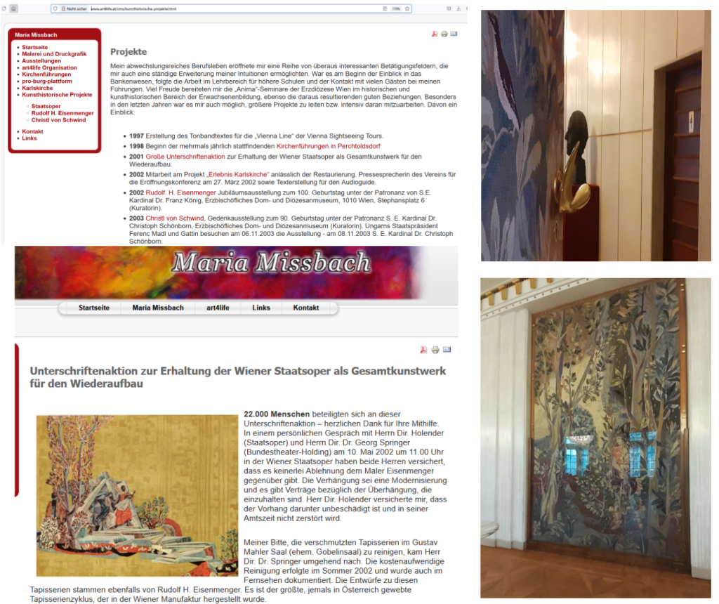 In einem persönlichen Gespräch mit Herrn Dir. Holender (Staatsoper) und Herrn Dir. Dr. Georg Springer (Bundestheater-Holding) am 10. Mai 2002 um 11.00 Uhr in der Wiener Staatsoper haben beide Herren versichert, dass es keinerlei Ablehnung dem Maler Eisenmenger gegenüber gibt. Die Verhängung sei eine Modernisierung und es gibt Verträge bezüglich der Überhängung, die einzuhalten sind. Herr Dir. Holender versicherte mir, dass der Vorhang darunter unbeschädigt ist und in seiner Amtszeit nicht zerstört wird. Meiner Bitte, die verschmutzten Tapisserien im Gustav Mahler Saal (ehem. Gobelinsaal) zu reinigen, kam Herr Dir. Dr. Springer umgehend nach. Die kostenaufwendige Reinigung erfolgte im Sommer 2002 und wurde auch im Fernsehen dokumentiert. Die Entwürfe zu diesen Tapisserien stammen ebenfalls von Rudolf H. Eisenmenger. Es ist der größte, jemals in Österreich gewebte Tapisserienzyklus, der in der Wiener Manufaktur hergestellt wurde.