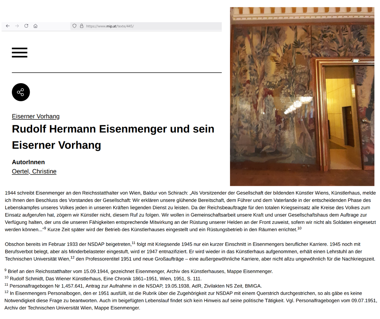 1939 wurde Eisenmenger Präsident des Wiener Künstlerhauses. Er war 37 Jahre alt und zu diesem Zeitpunkt in Bezug auf den Nationalsozialismus absolut kein unbeschriebenes Blatt. Er hatte sich schon in den 1930er-Jahren stark in den nationalsozialistischen Kreisen engagiert. Seit Februar 1933 war er Mitglied der NSDAP. Das war in Österreich zu diesem Zeitpunkt noch legal. Er blieb allerdings auch Mitglied, nachdem die NSDAP im Juni 1933 in Österreich verboten wurde. Eisenmenger war 1936 Gründungsmitglied im Bund deutscher Maler Österreichs. Das war zu dem Zeitpunkt legal, aber es war ganz klar eine NSDAP-nahe Organisation, die propagandistisch agierte. Ich möchte noch ein anderes Gründungsmitglied dieser 17 Organisation erwähnen, Leopold Blauensteiner, Künstler, Mitglied des Künstlerhauses, ganz wichtig für Eisenmenger in einer Art Mentorfunktion. Er war Präsident des Künstlerhauses vor Eisenmenger und von 1939 bis 1945 Landesleiter der Reichskammer der bildenden Künste in Wien. 1936 hat Eisenmenger an der Kunstolympiade der Olympischen Sommerspiele in Berlin teilgenommen. Das Künstlerhaus hatte die Jury für die österreichischen Teil nehmer zusammengestellt, um die Künstler auszuwählen, die nach Berlin geschickt werden sollten. 1937 hat Eisenmenger dann an der Großen Deutschen Kunstausstel lung teilgenommen, das war die Propagandaausstellung, die parallel zur Ausstellung Entartete Kunst in München stattfand. Interessant dabei ist, dass insgesamt 560 Künstler*innen teilnahmen, darunter nur 28 österreichische Künstler. Eisenmenger hat allerdings nicht nur an der Ausstellung teilgenommen, vielmehr, und das ist bemerkenswert und aussagekräftig, war er eines der nur sieben Jurymitglieder, die die Arbeiten für die Große Deutsche Kunstausstellung ausgesucht haben. Die Machtübernahme der Nationalsozialisten stellte für ihn eigentlich keine Zäsur dar, für das Künstlerhaus hingegen schon. Wir wissen, dass die Mitgliederzahl durch die Gesetze der Reichskulturkammer und die Ausschlüsse von 508 auf 330 Personen reduziert wurde. Eisenmenger wurde im Dezember 1938 zunächst Vizepräsident des Künstlerhauses. Leopold Blauensteiner bot ihm dann an, die Präsidentschaft zu übernehmen, Eisenmenger hat dies zunächst zweimal abgelehnt. Im Nachhinein, nach 1945, wurde oft behauptet, dass man sich Eisenmenger als Präsident gewünscht hätte, um einen wirklich nationalsozialistisch gesinnten Vorstand zu verhindern. Es gibt aber einen Brief von Blauensteiner von 1939, in dem dieser versuchte, Eisenmenger zu überreden. Blauensteiner schrieb, ich zitiere: „Insbesondere entspreche ich aber einem Wunsch Berlins, wenn ich diese Angelegenheit nochmals aufrolle.“ 1939 wurde Eisenmenger dann Präsident, und er blieb bis zum Kriegsende in dieser Funktion. Er hat während der NS-Zeit an zahlreichen Ausstellungen teilgenommen. Zweimal hat er den deutschen Pavillon auf der Biennale in Venedig mitbespielt. Und er hat, wie erwähnt, von 1937 an an den Großen Deutschen Kunstausstellungen teilgenommen. Er hat zahlreiche großformatige wandgebundene Arbeiten vor allem für den öffentlichen Raum angefertigt. In der NS-Zeit ist zum Beispiel die Arbeit für das Reichspropagandaministerium in Berlin entstanden. Anfang 1945 hat er dann den Auftrag bekommen, für Hitler ein Geburtstagsgeschenk anzufertigen. Einen Gobelin, den er noch Anfang 1945 entworfen hat. 1943 hatte er den Professorentitel erhalten. Das war eine Auszeichnung, die von Hitler genehmigt werden musste. Er wurde in die Liste der Künstler im Kriegseinsatz aufgenommen. Und die NS-Elite, darunter Joseph Goebbels, hat Arbeiten von ihm erworben.